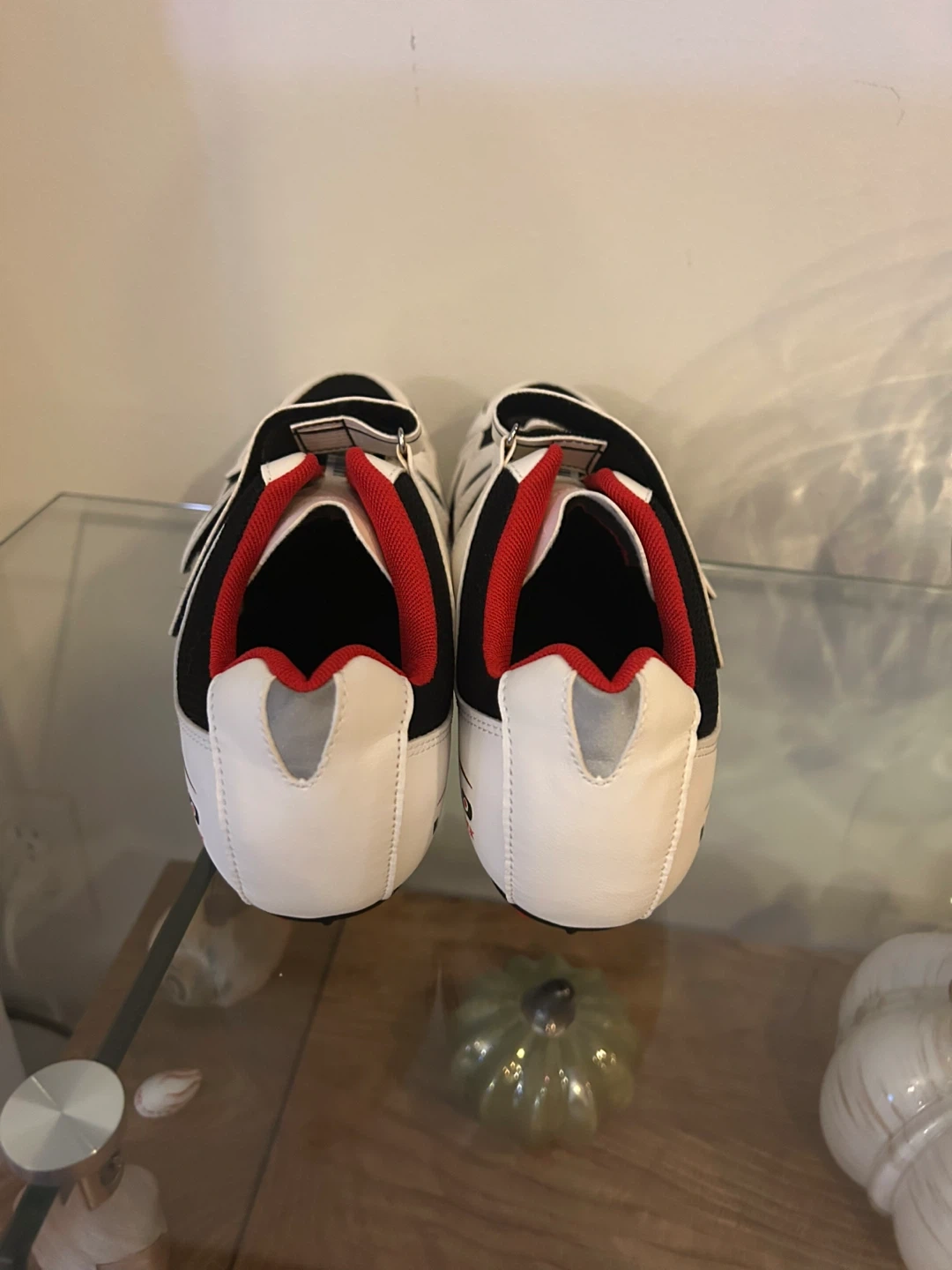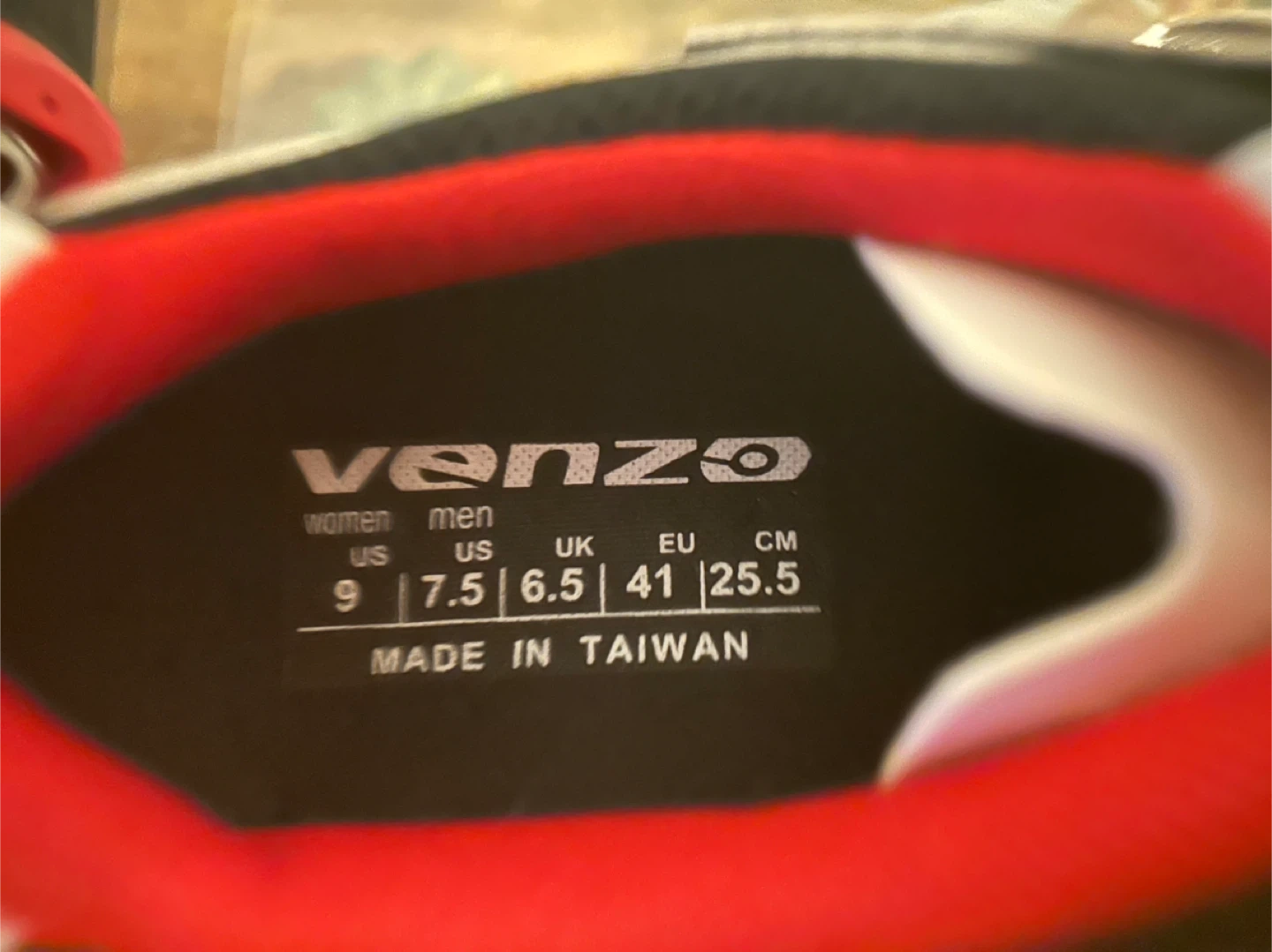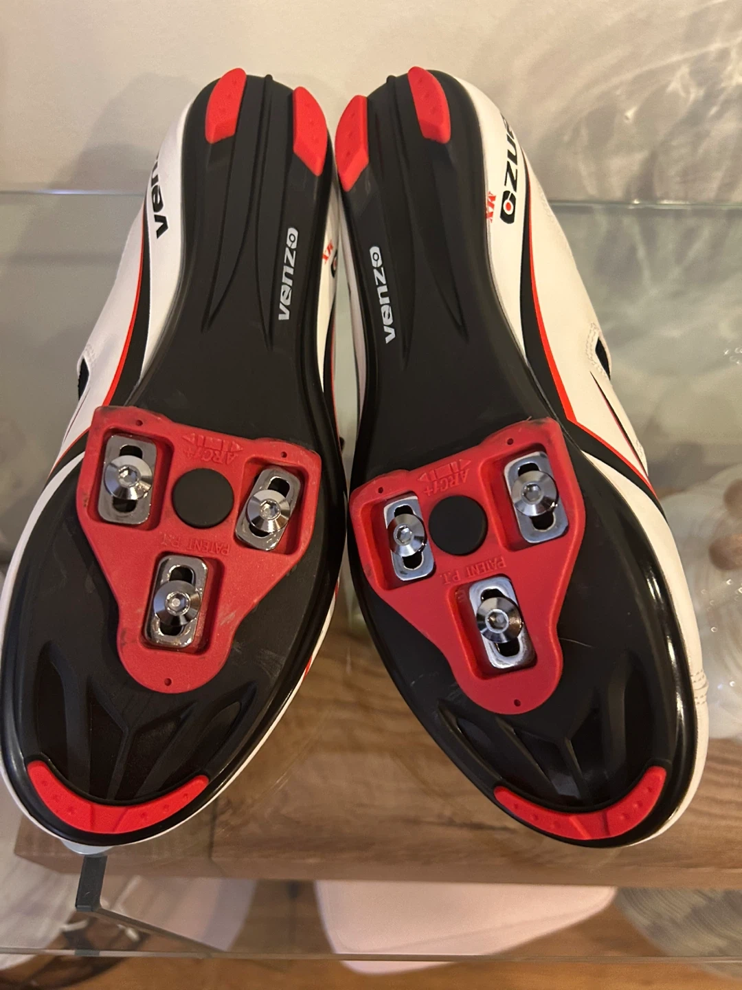 White and black Venzo cycling shoes with red accents. Features adjustable strap closures for a secure fit. Includes cleats. Size 9