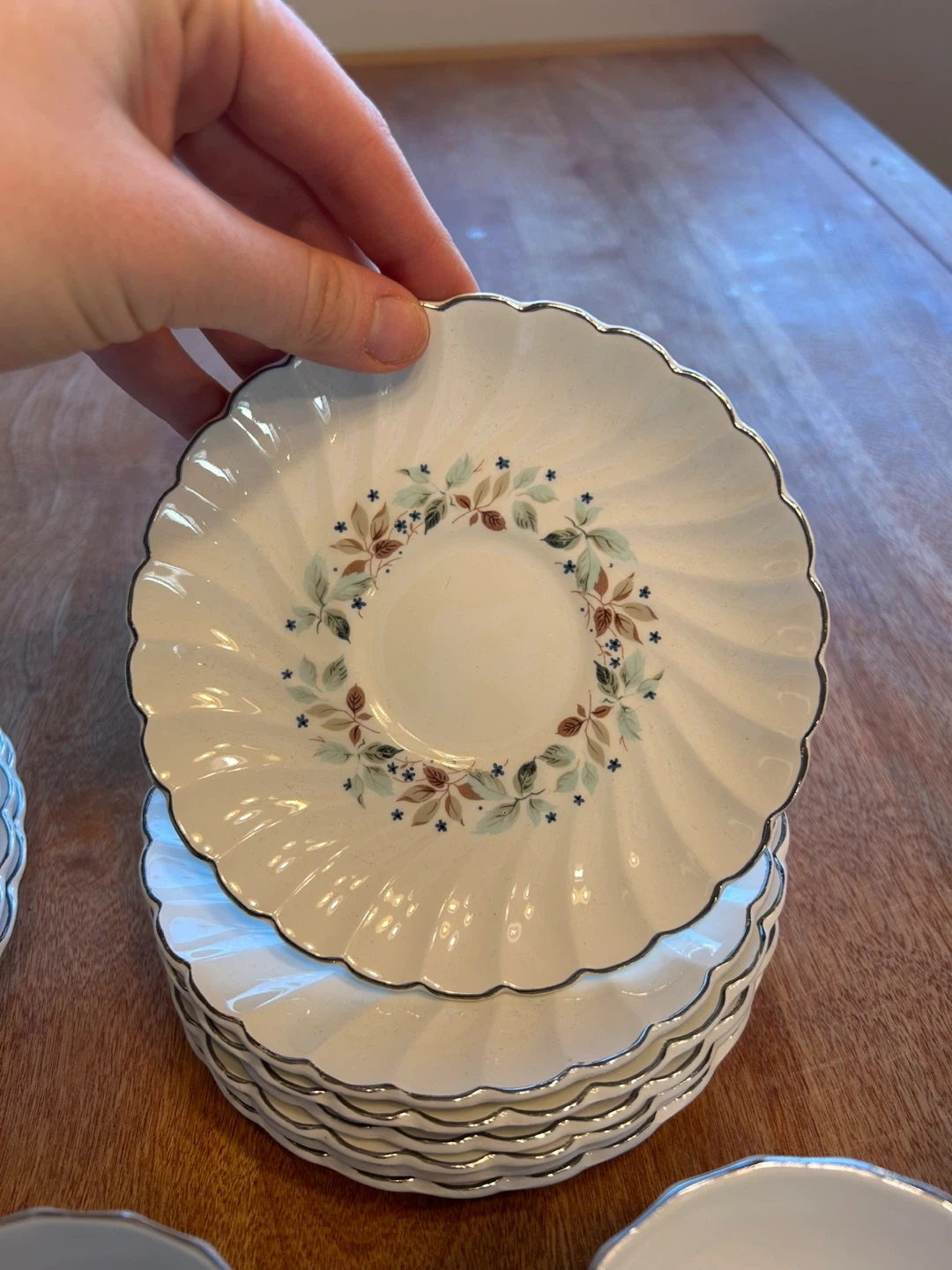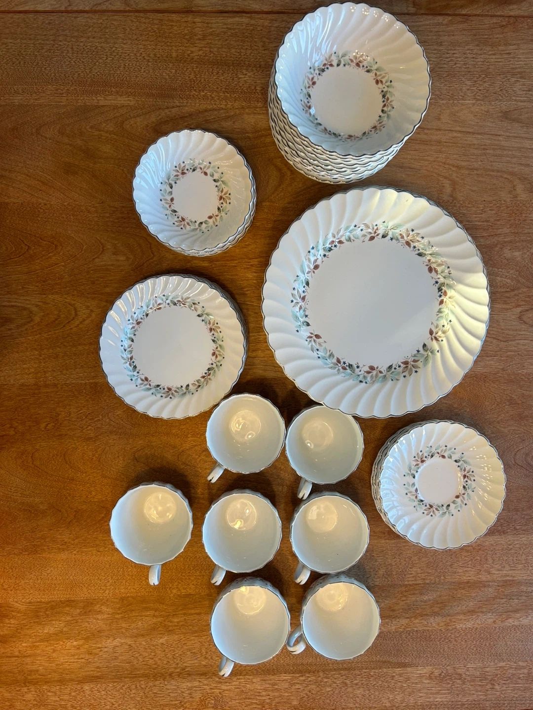 Selling a beautiful vintage snowhite Regency Johnson BROs dinnerware set! This set includes plates, bowls, and teacups, all in excellent condition. The delicate floral pattern and elegant design make it perfect for special occasions or everyday use. Add a touch of vintage charm to your dining experience!