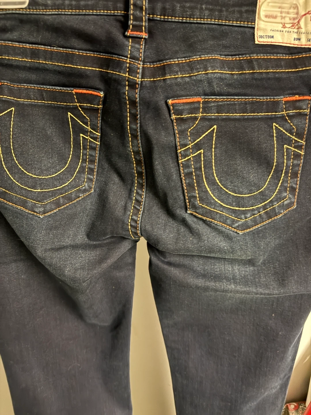 Dark wash denim jeans with signature orange stitching. Classic True Religion back pocket design. Material is a cotton blend for comfort.