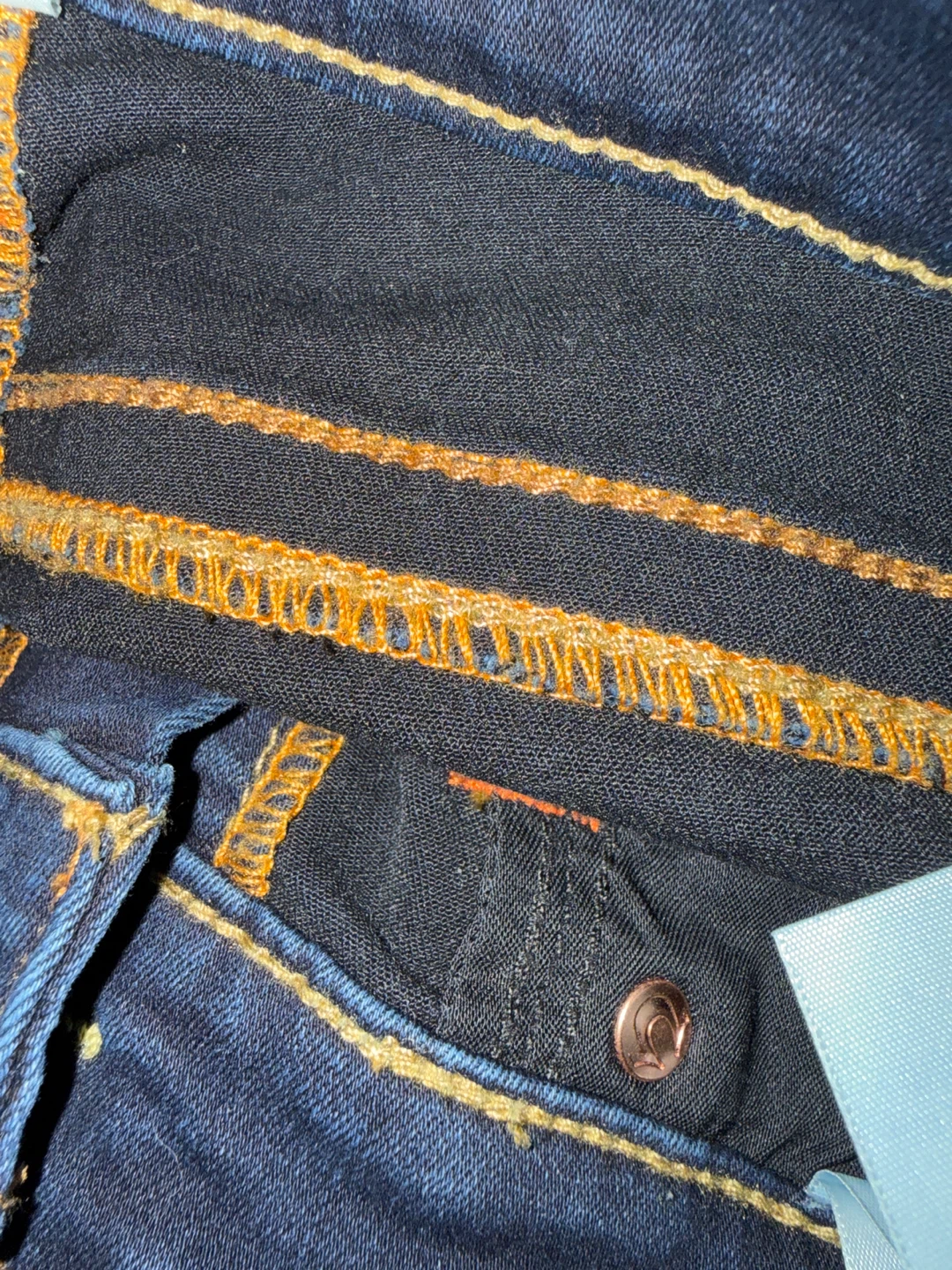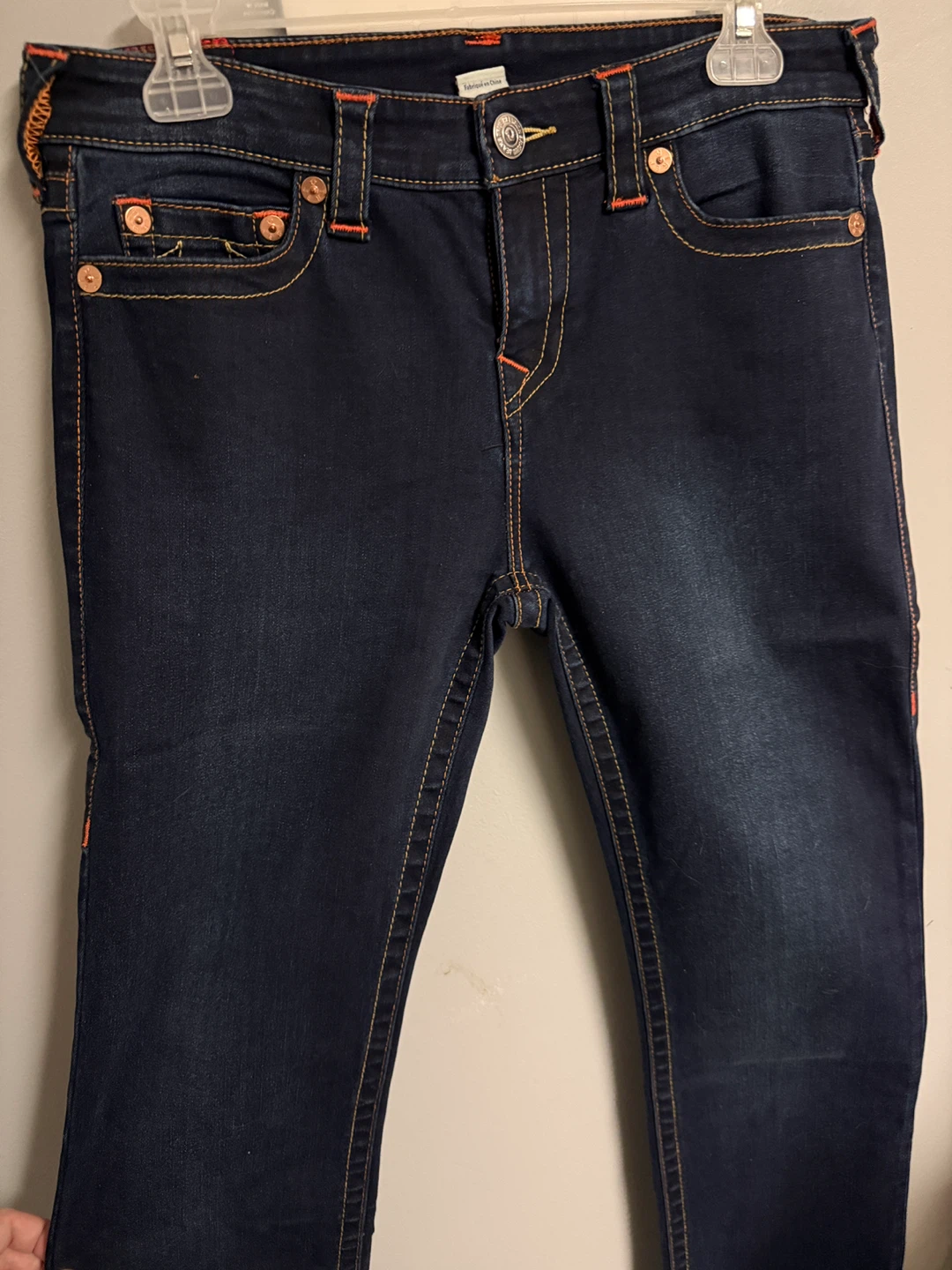 Dark wash denim jeans with signature orange stitching. Classic True Religion back pocket design. Material is a cotton blend for comfort.