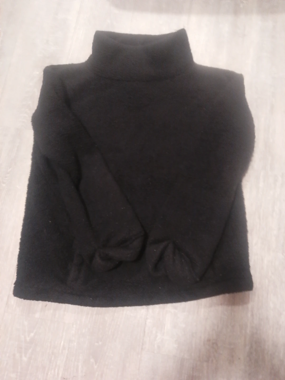 This is a black turtleneck sweater. It's made of a soft, fuzzy material. The sweater's texture adds a cozy feel.