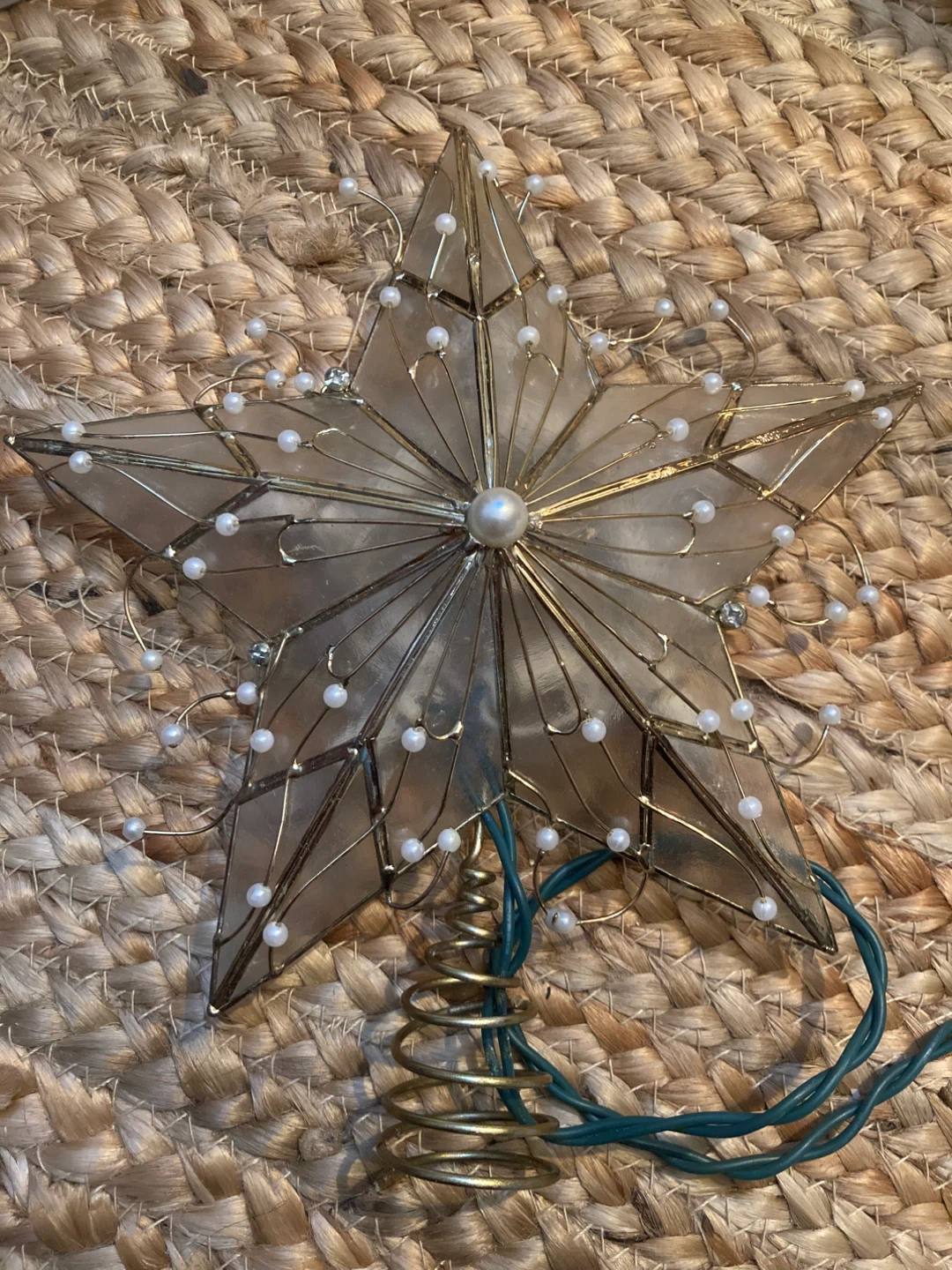 This Capiz shell and pearl star tree topper has a translucent design with delicate beading. It lights up with warm white bulbs and features a metal coil base for easy attachment. It's ready to bring a festive glow to your holiday tree! Star is 7 inches tall, base is 3 inches.