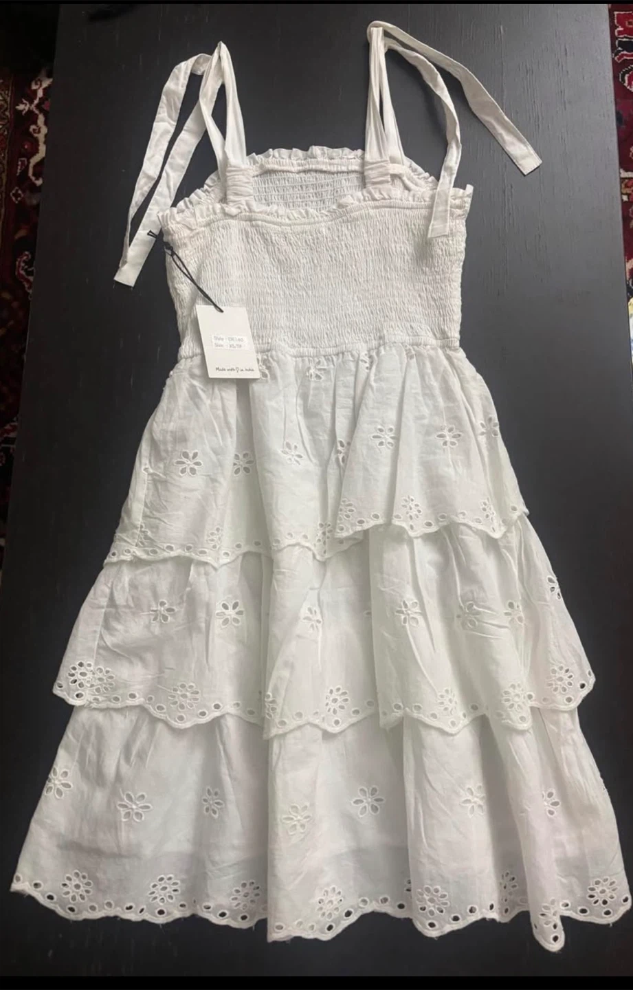 This white dress features a smocked bodice and tiered skirt with eyelet detailing. It's made with cotton and has tie straps. Perfect for summer. Brand new with tags!