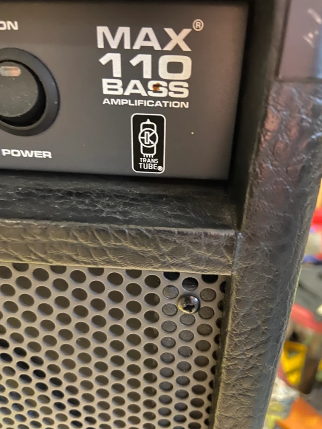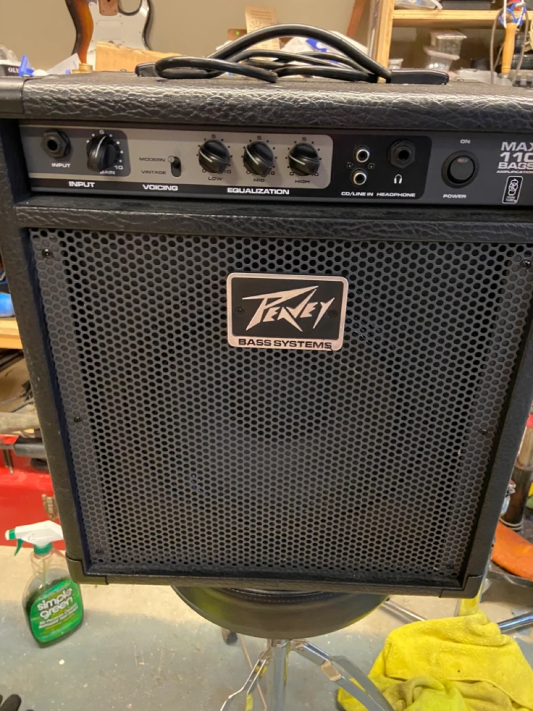 This is a Peavey MAX 110 bass amplifier. It features "Trans Tube" technology and offers various equalization controls. Includes CD/Line in and headphone output.
