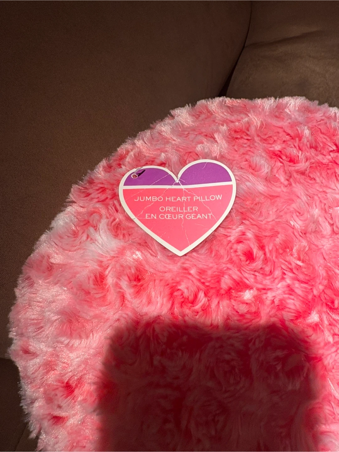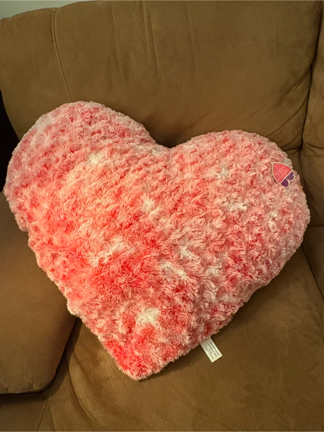 This is a jumbo heart-shaped pillow. It's covered in soft, fluffy pink ‘roses’ with white accents. Perfect addition to any room!