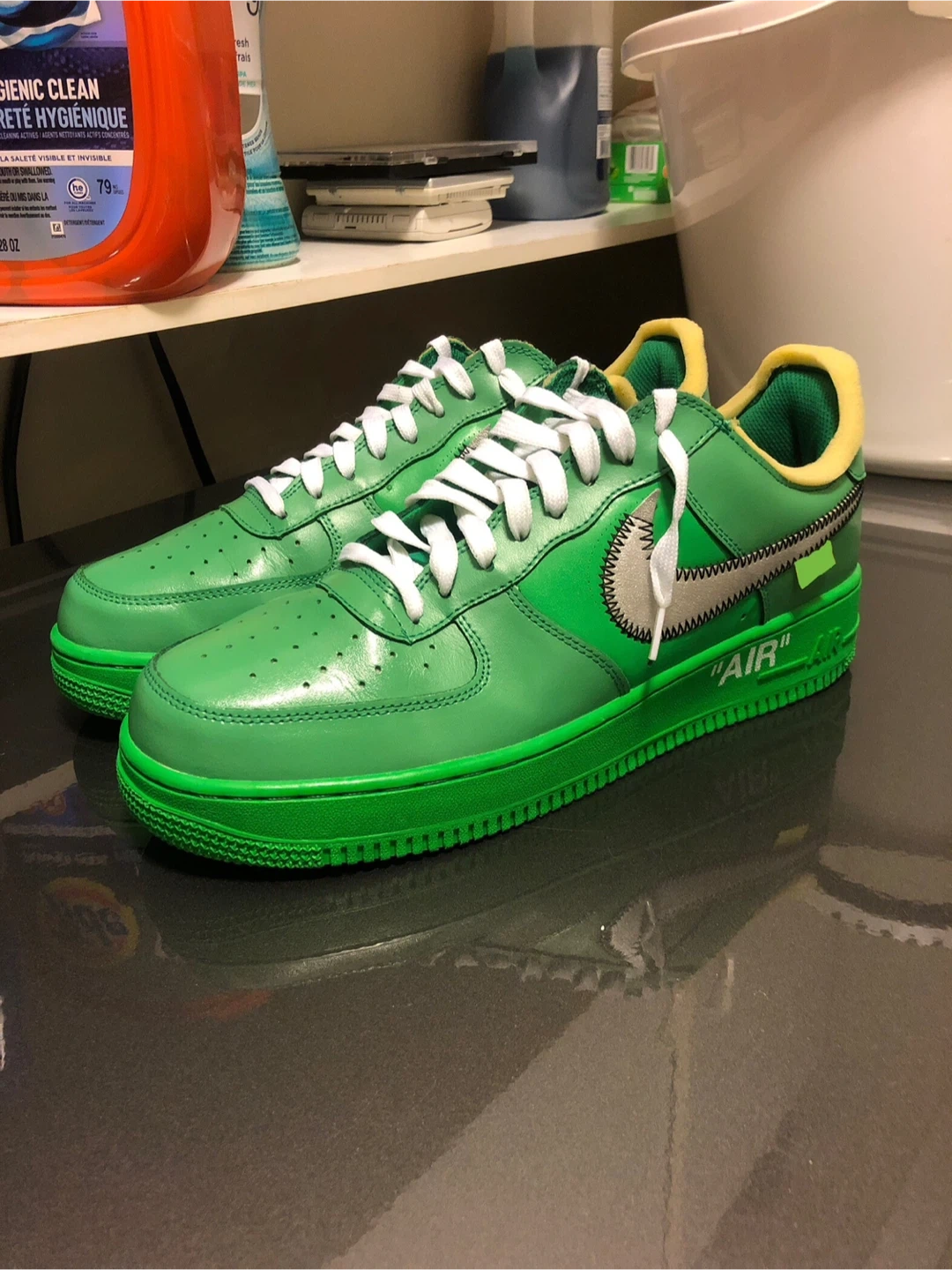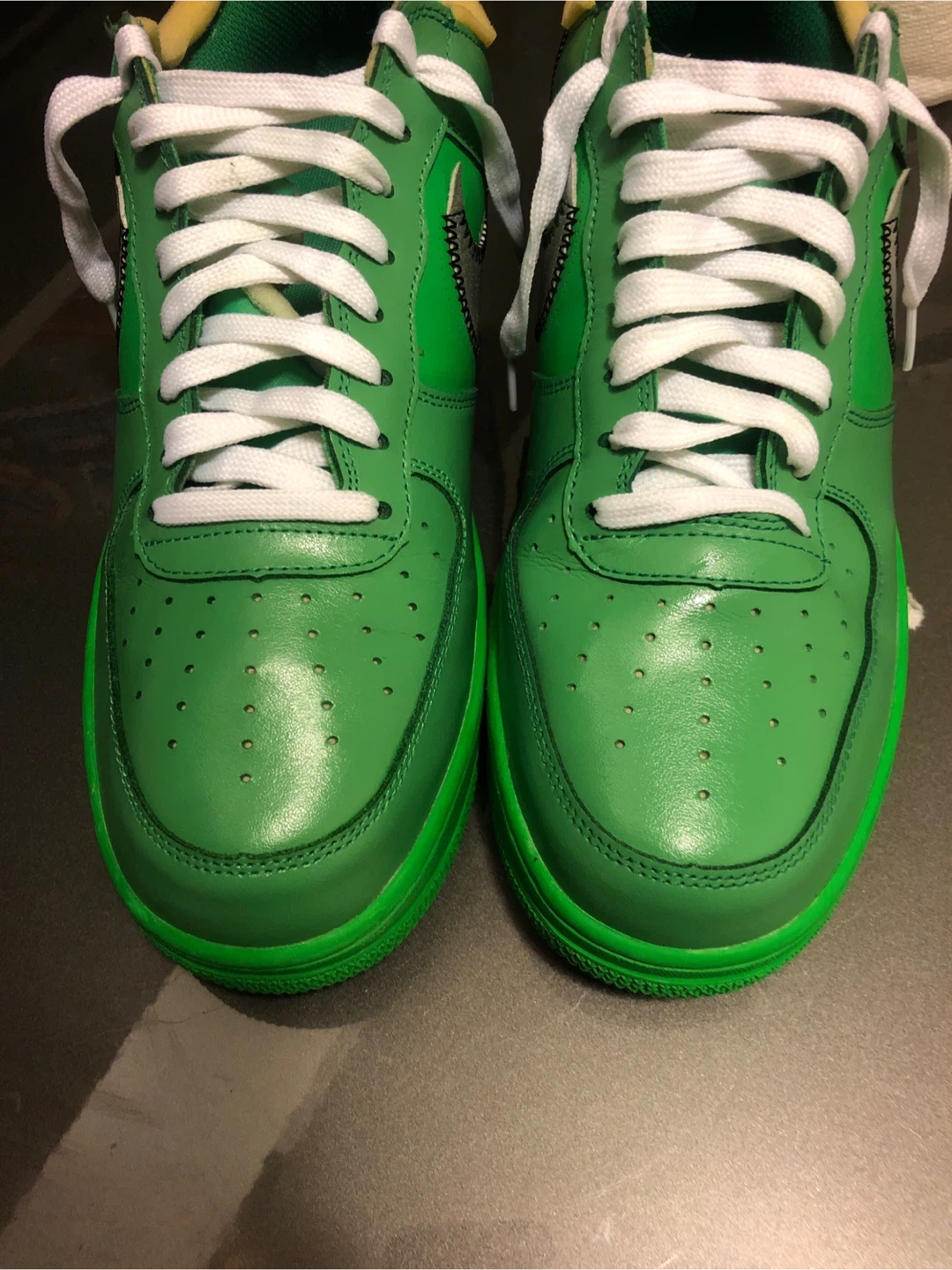 These Nike Air Force 1 shoes are a vibrant green colour. They feature white laces and the classic Nike Air sole. These sneakers are perfect for adding a pop of colour to any outfit.