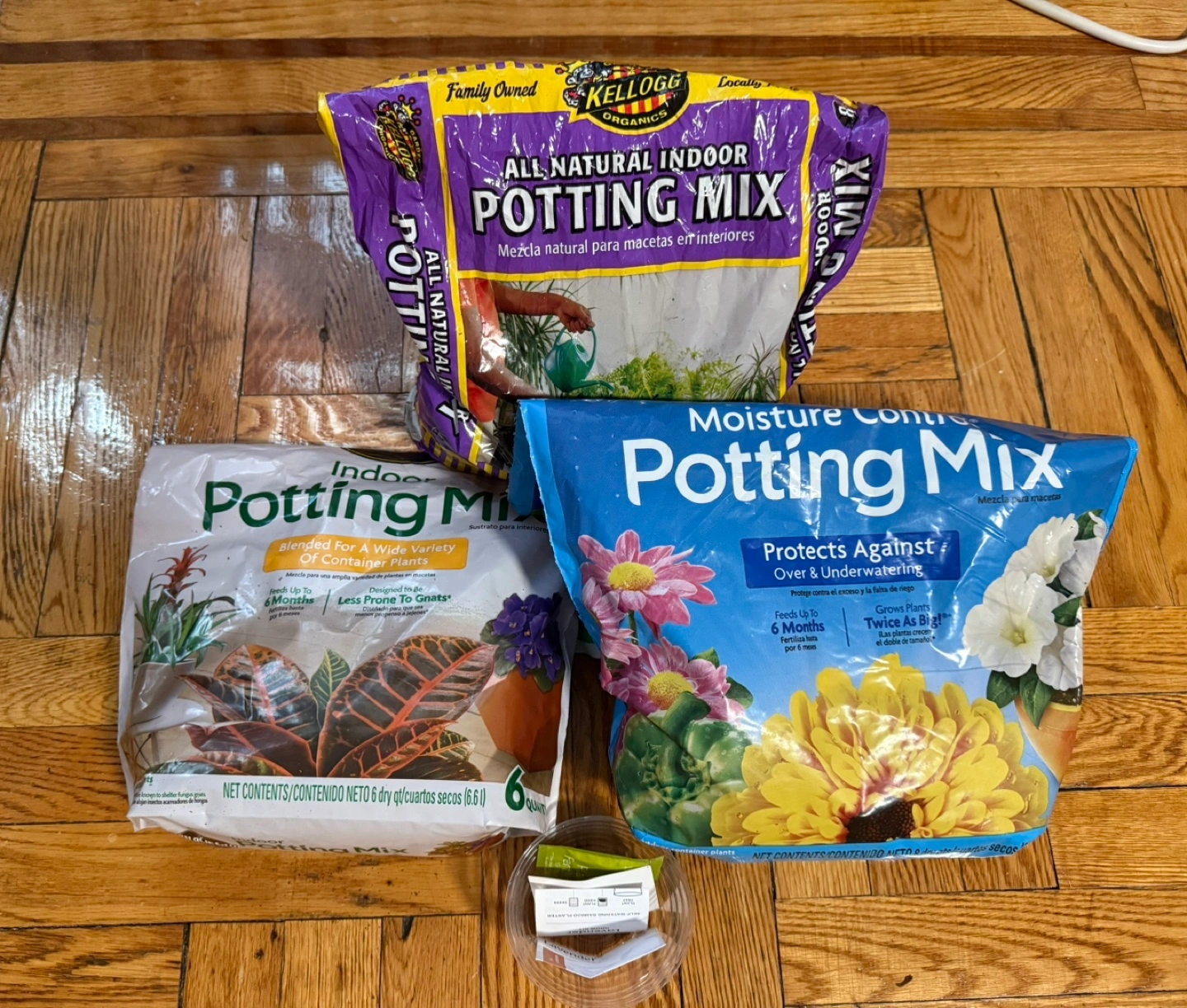 Three bags of indoor potting mix.