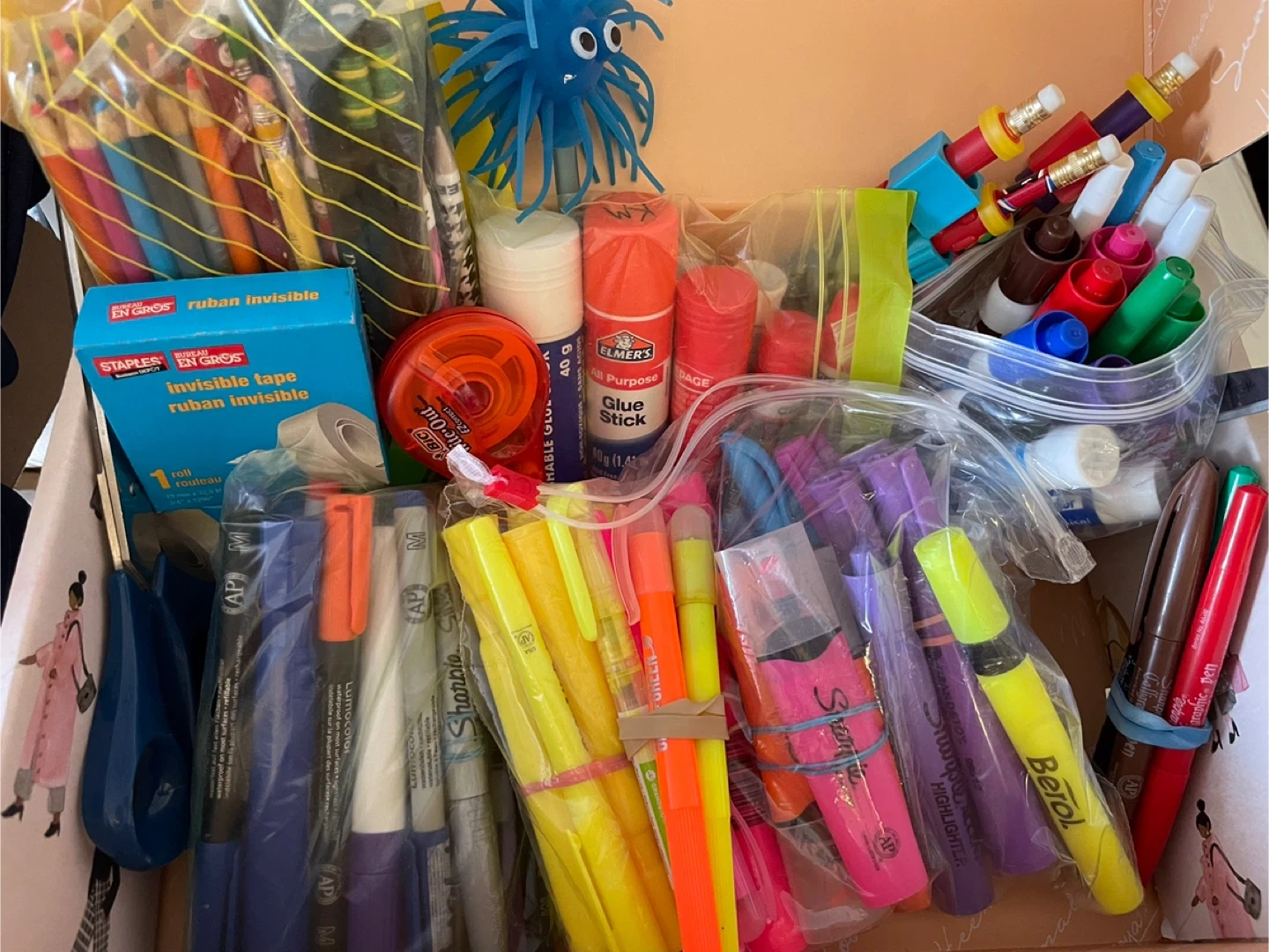 A collection of pens, markers, highlighters, pencils, and glue sticks. Includes scissors, tape, and a correction tape. Lots of Sharpies in 3 sizes are also included. New and like new.