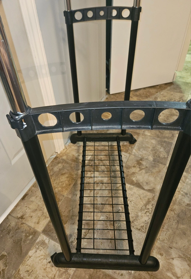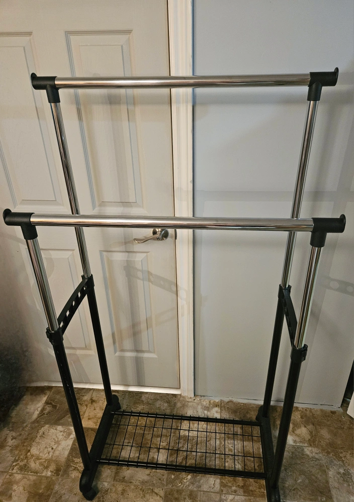 Adjustable height. Two hanging rods. Belt and scarf circular hangers. Bottom shelf for shoes or storage. Sturdy metal construction. Excellent for small spaces.