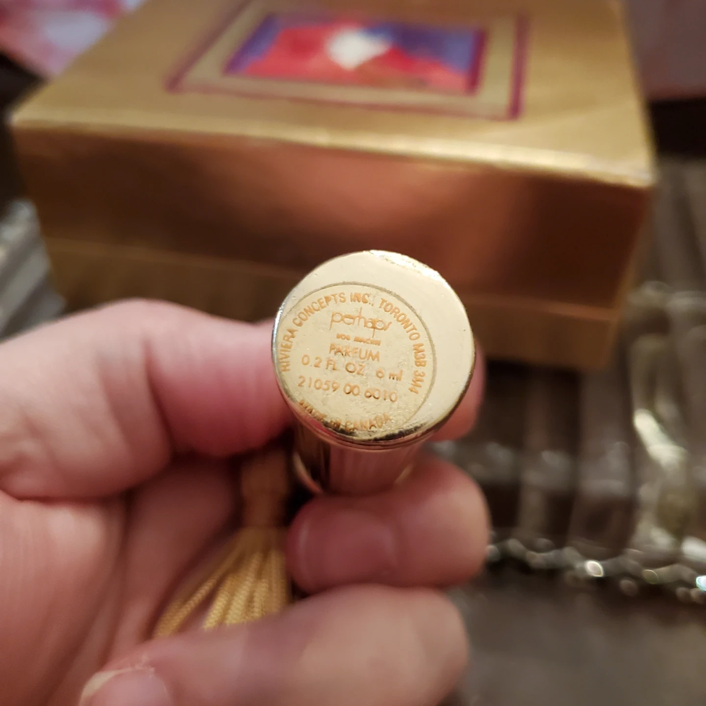 14k gold plated over metal 7ml 'Mackie' Parfum oil in the scent 'Perhaps' it is full never used. The 'Perhaps' oil perfume scent is very hard to come by.