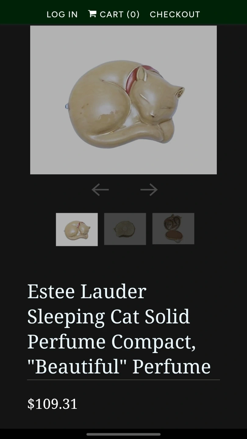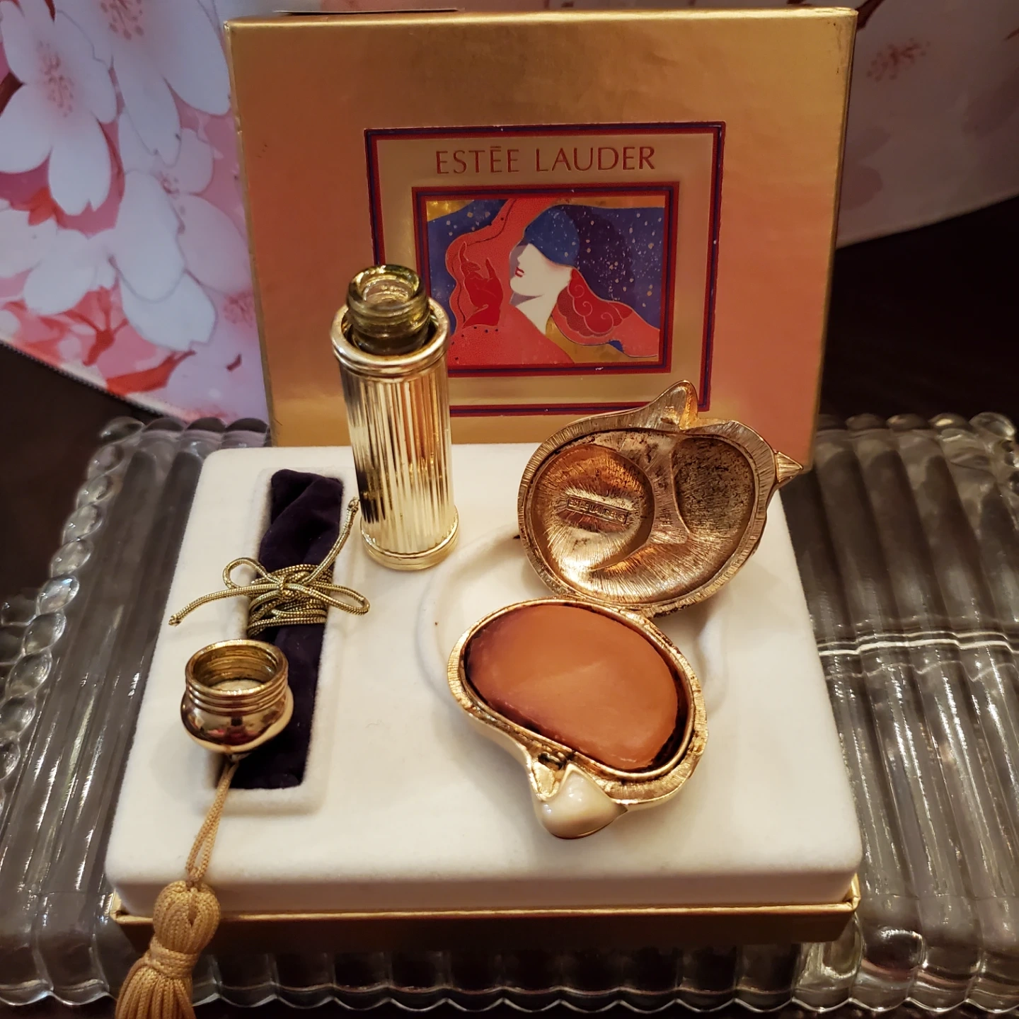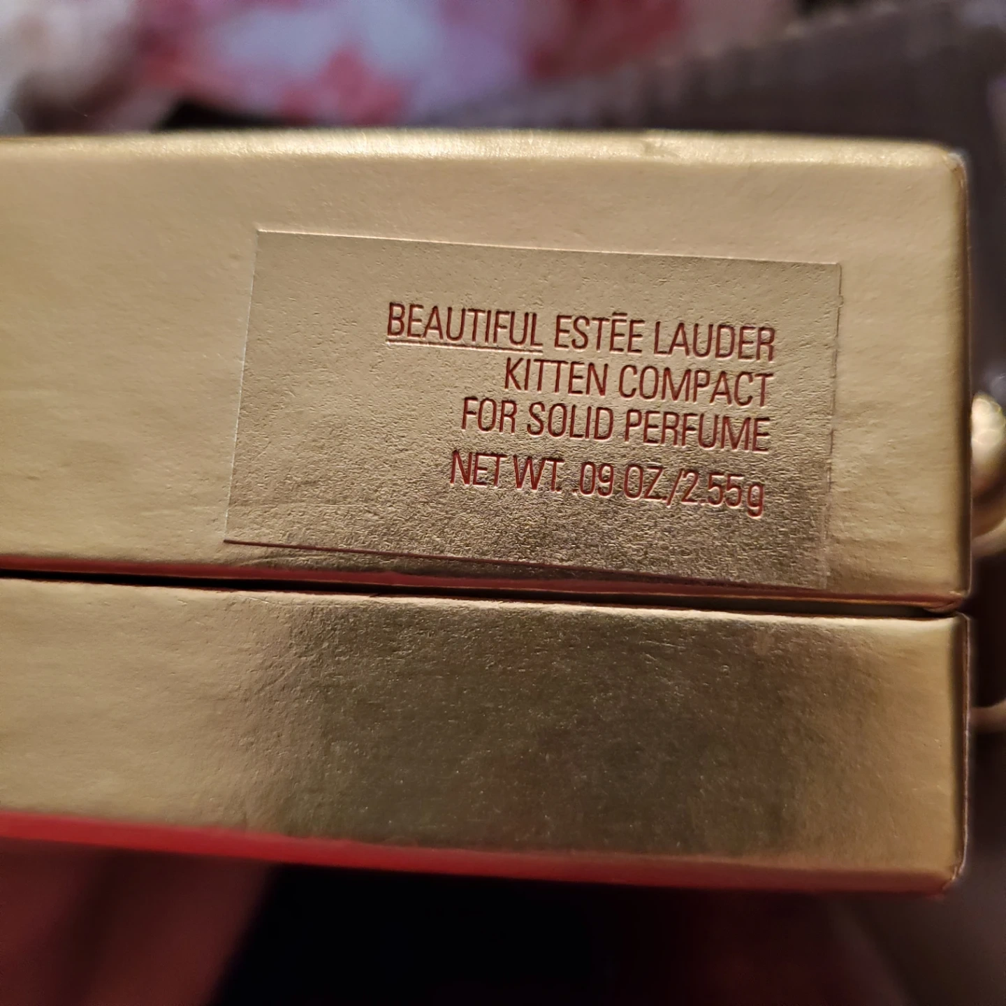 A vintage Estée Lauder Parfum Cream Kitten Charm in the scent 'Beautiful'. It is made of heavy set metal and has never been used. Comes in its original box with a carrying sack.