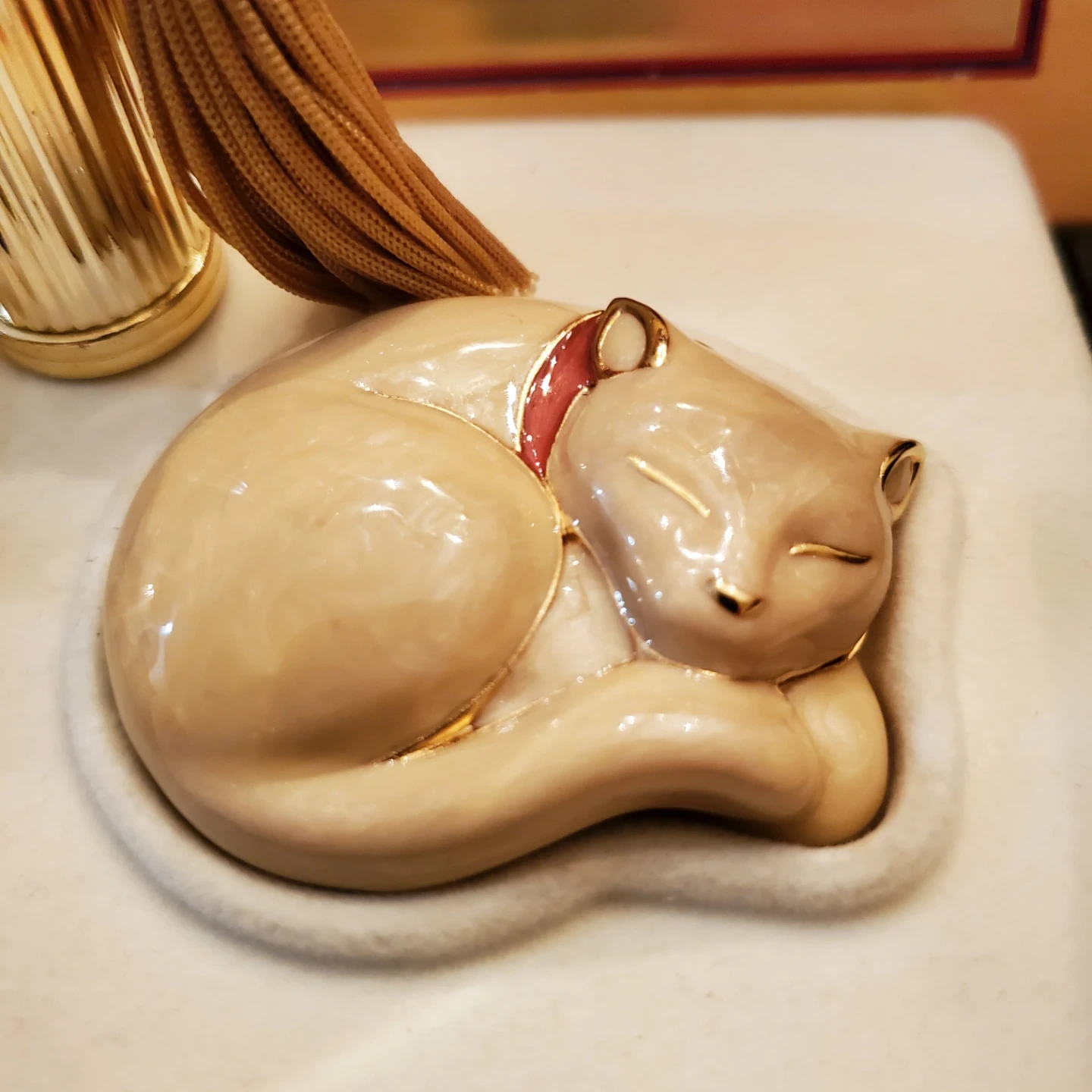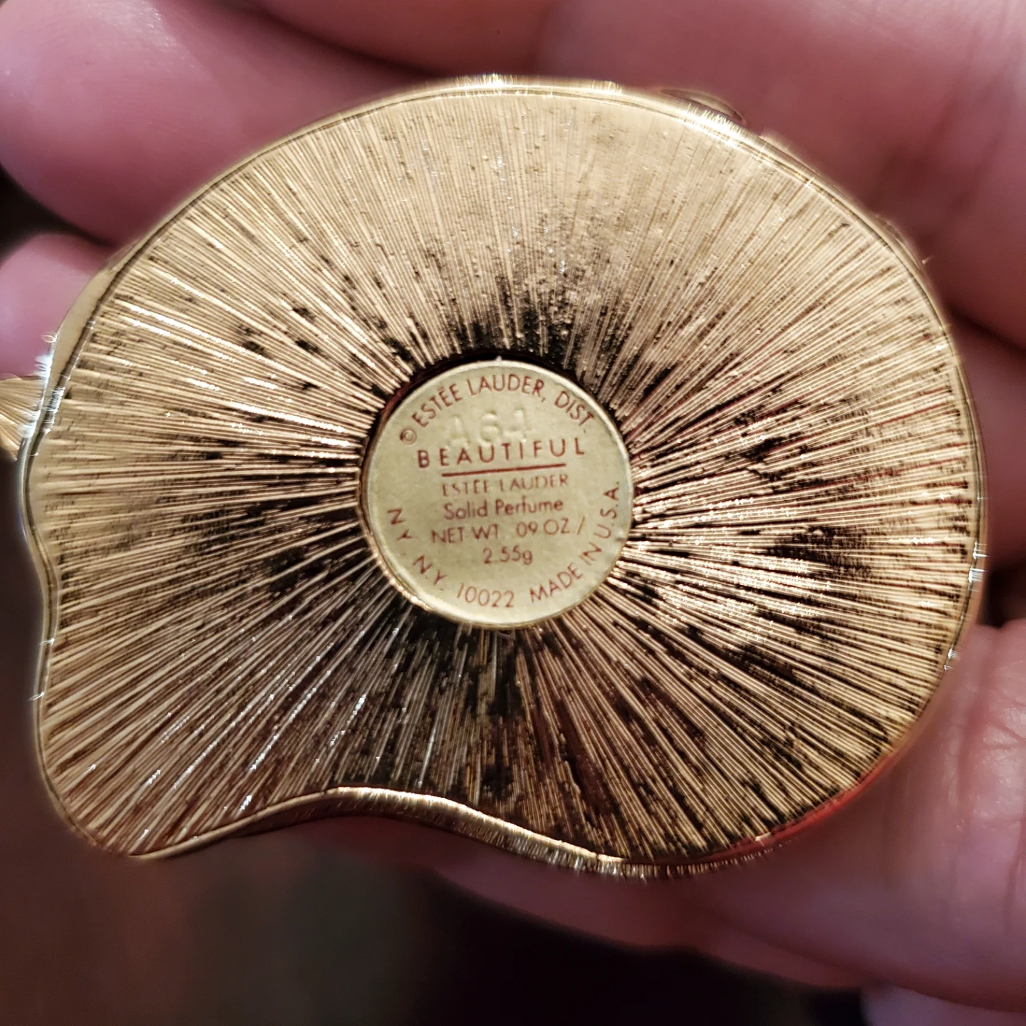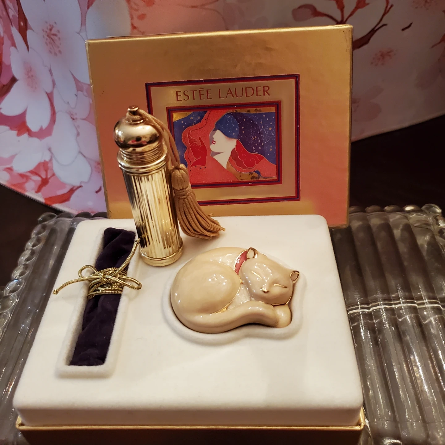 A vintage Estée Lauder Parfum Cream Kitten Charm in the scent 'Beautiful'. It is made of heavy set metal and has never been used. Comes in its original box with a carrying sack.