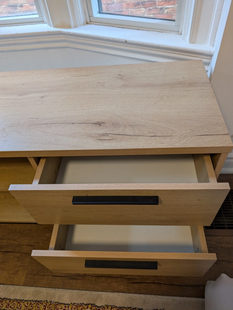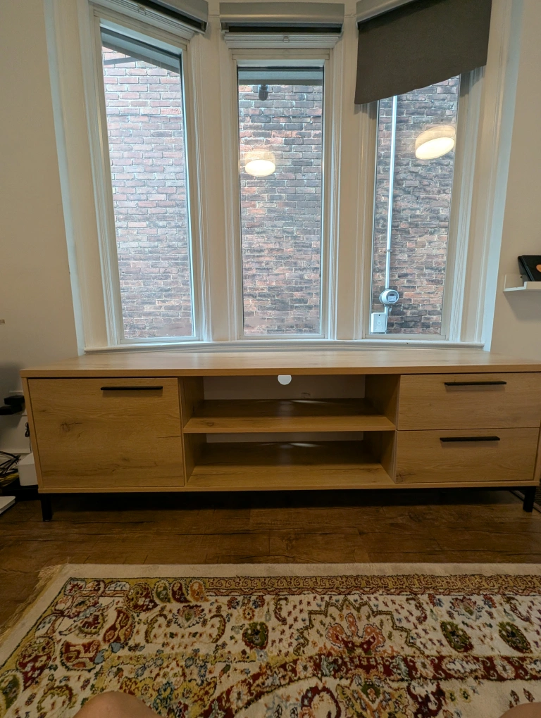 TV stand with 2 drawers and 2 cabinet doors. 1 open shelf. Black metal legs.