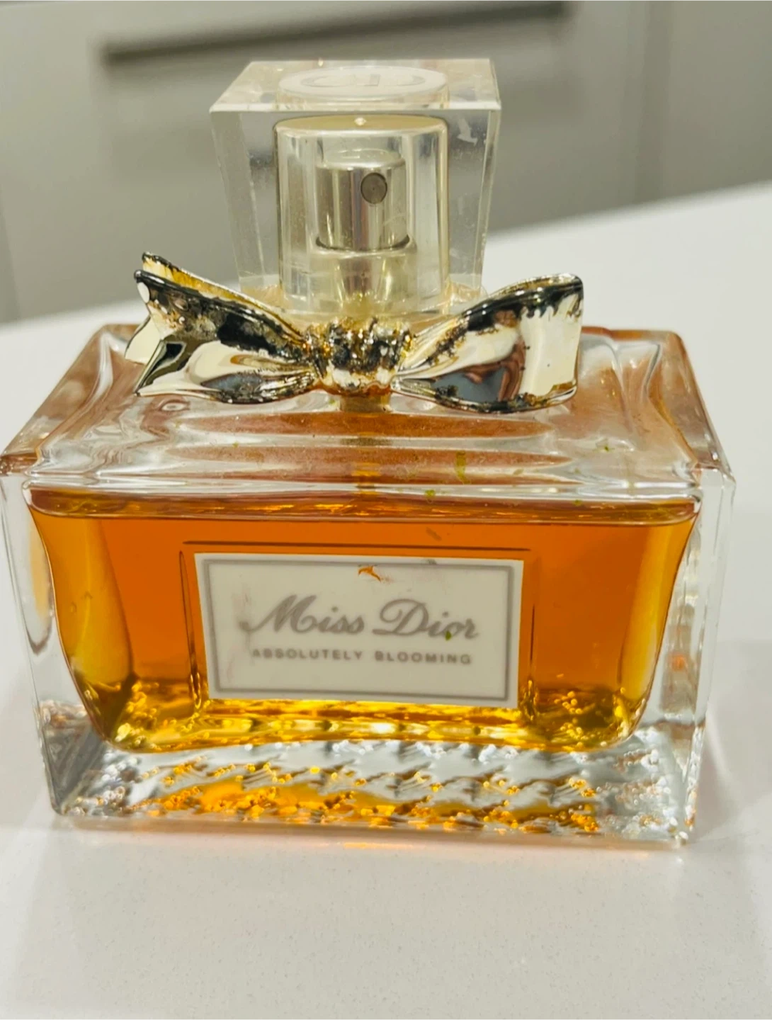 Dior Miss Dior Absolutely Blooming Eau de Parfum. This fragrance comes in a beautiful glass bottle adorned with a silver bow. It's a floral and fruity scent.