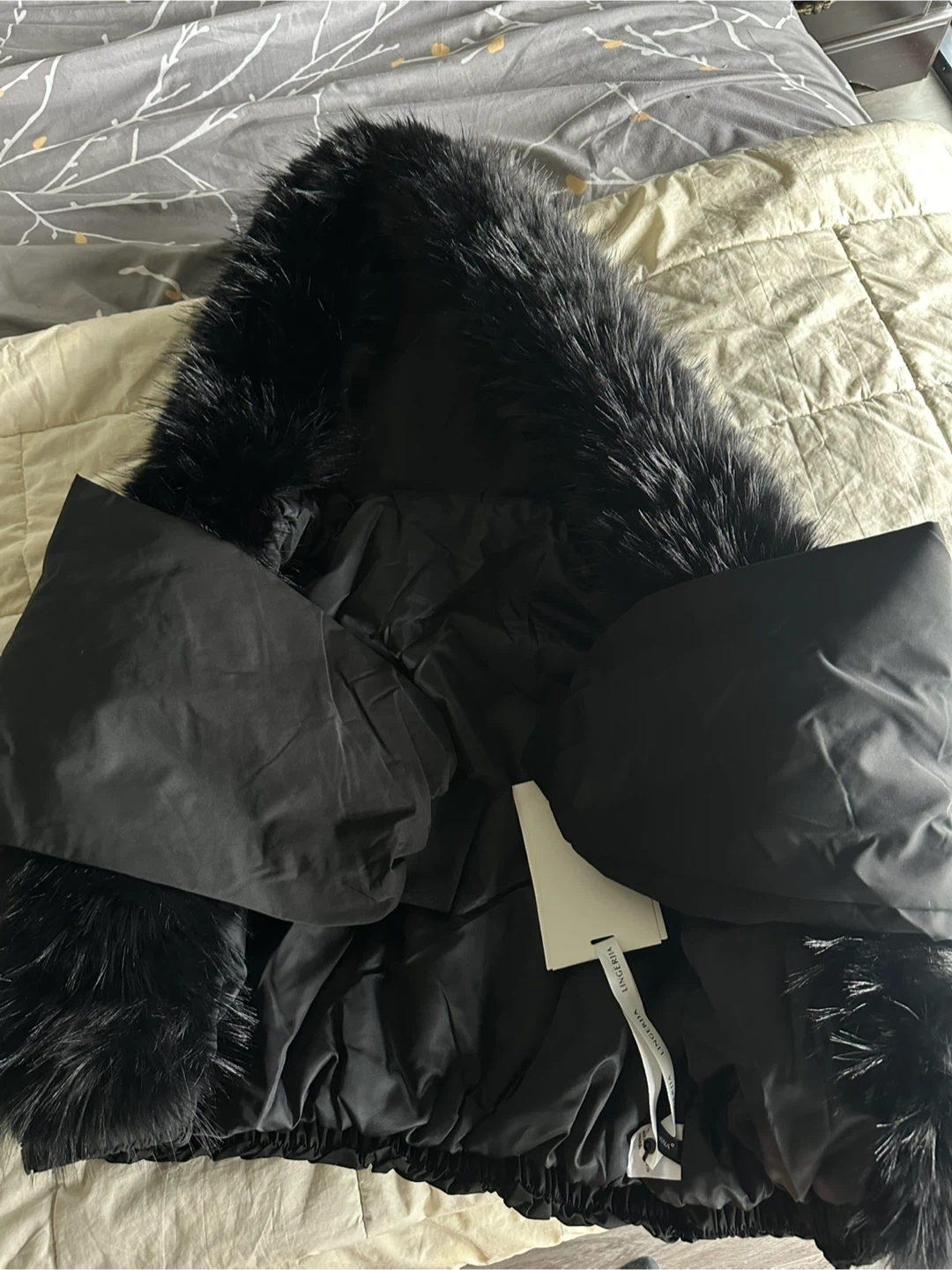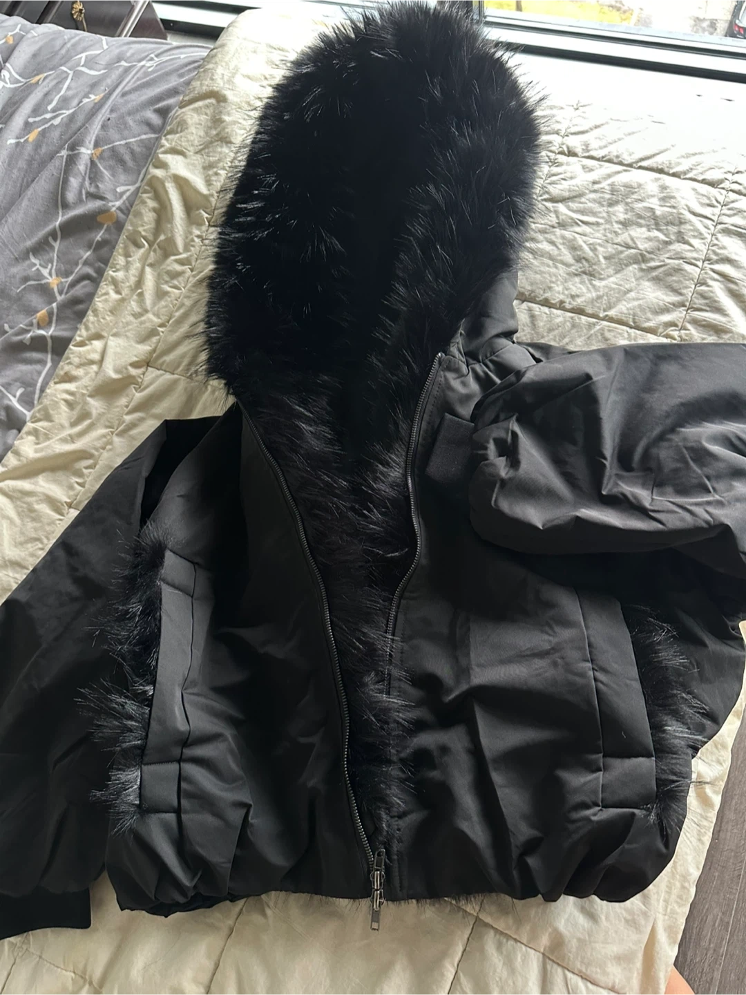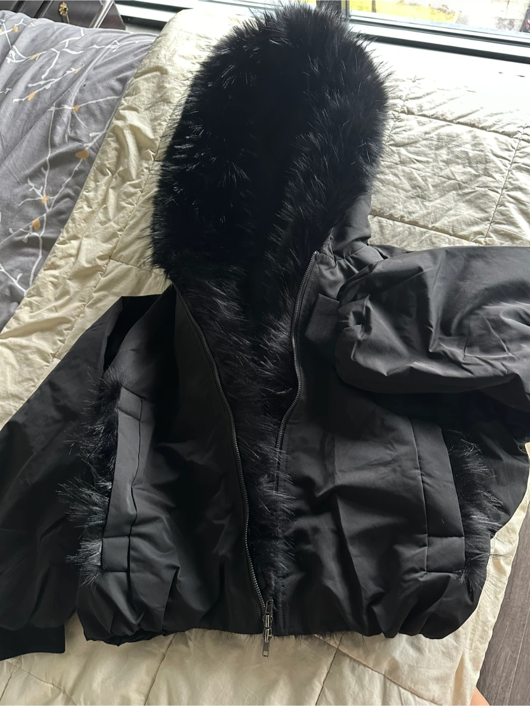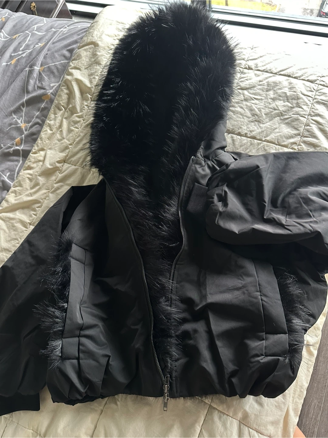 Selling a stylish black hooded jacket with fur trim! It's in great condition and perfect for adding a touch of warmth and style to your wardrobe. The jacket is a size medium.