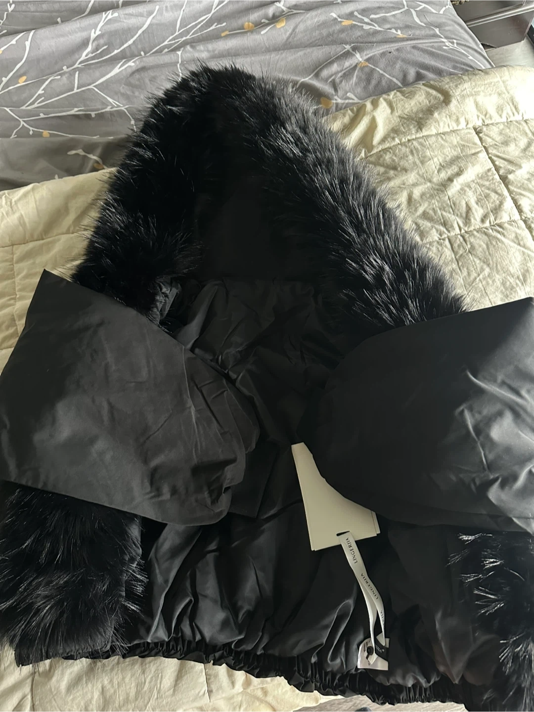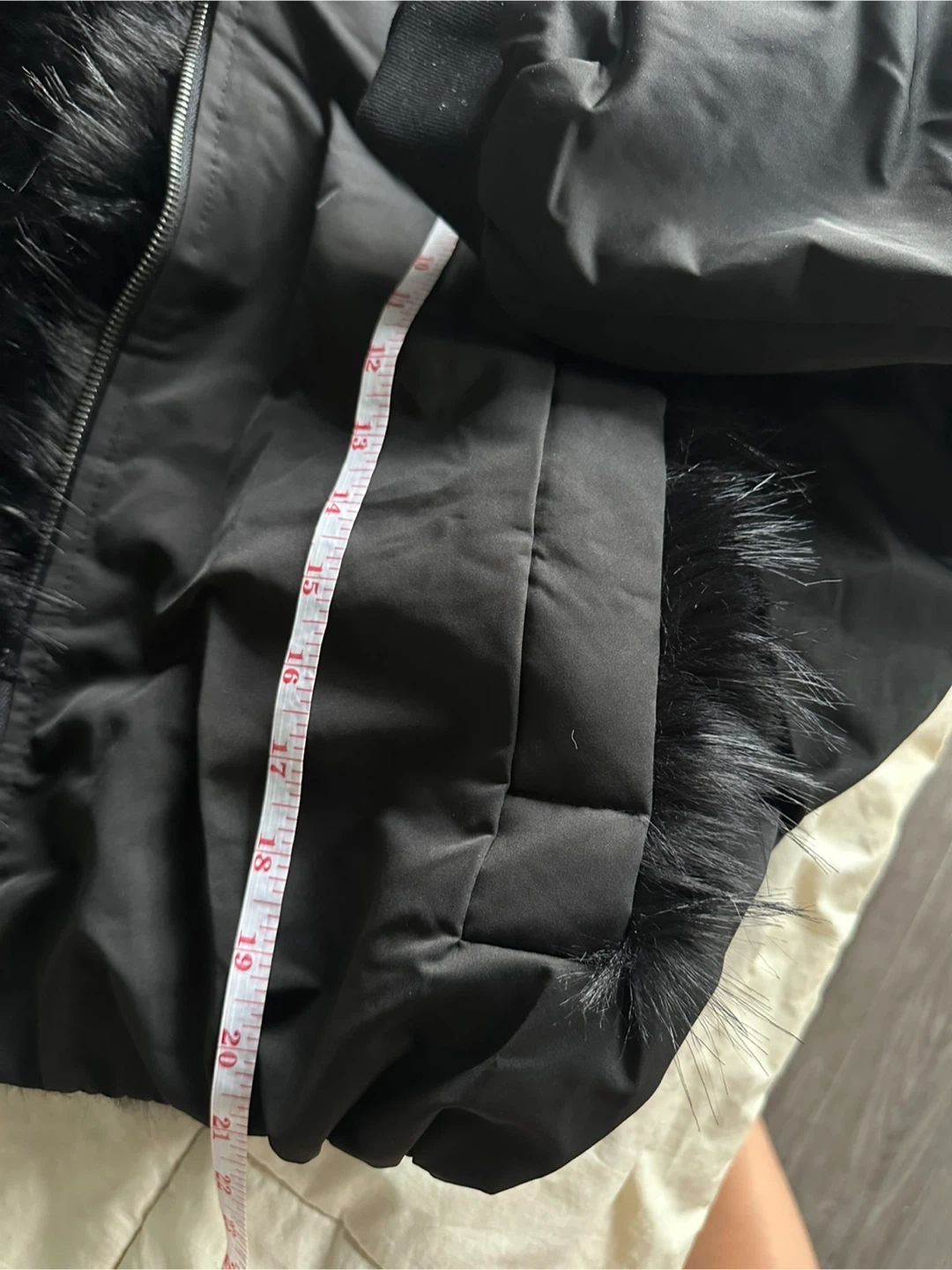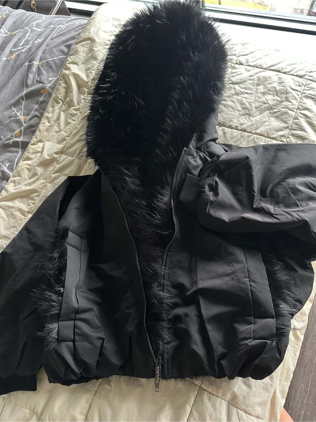 Selling a stylish black hooded jacket with fur trim! It's in great condition and perfect for adding a touch of warmth and style to your wardrobe. The jacket is a size medium.