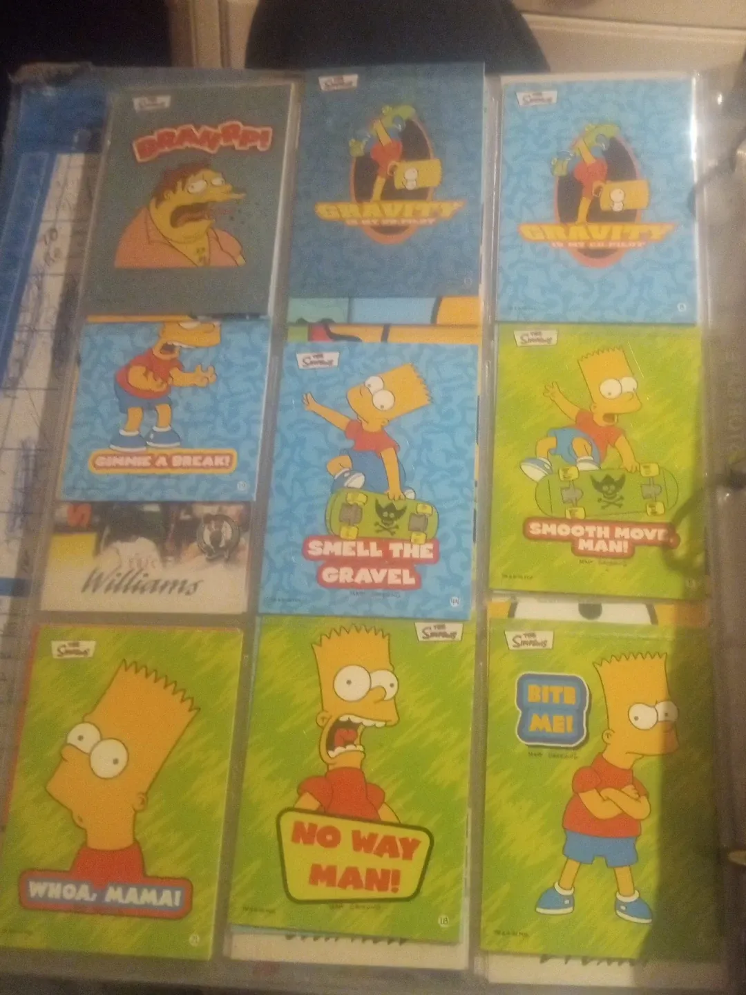 Selling a collection of The Simpsons trading cards! These cards feature fun graphics and memorable quotes like "GRAVITY IS MY PILOT", "SMELL THE GRAVEL", and "NO WAY MAN!"
