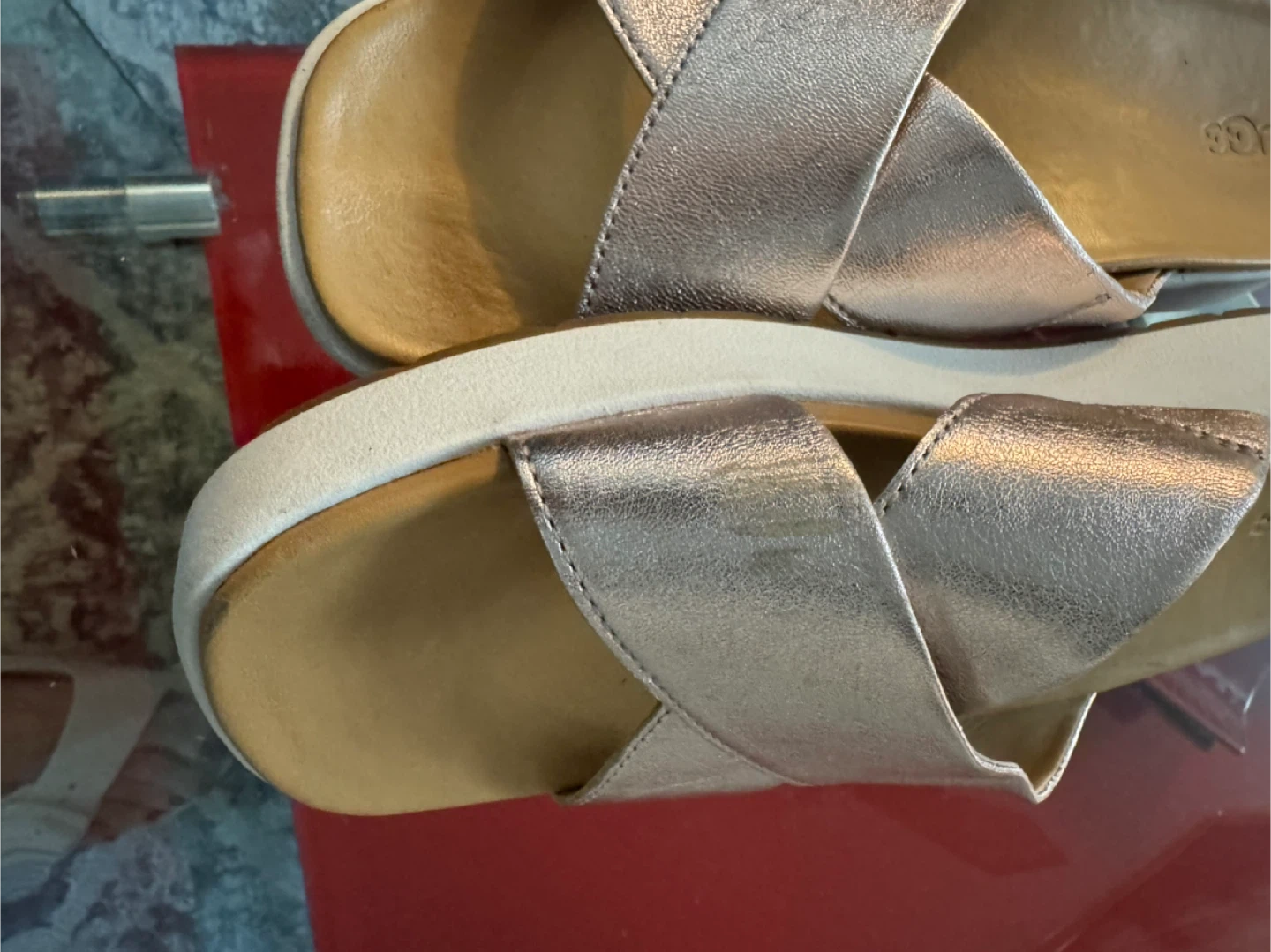 These are a pair of UGG sandals with a criss-cross design. They are a rose gold colour. A slight scratch on the inner side of one sandal.