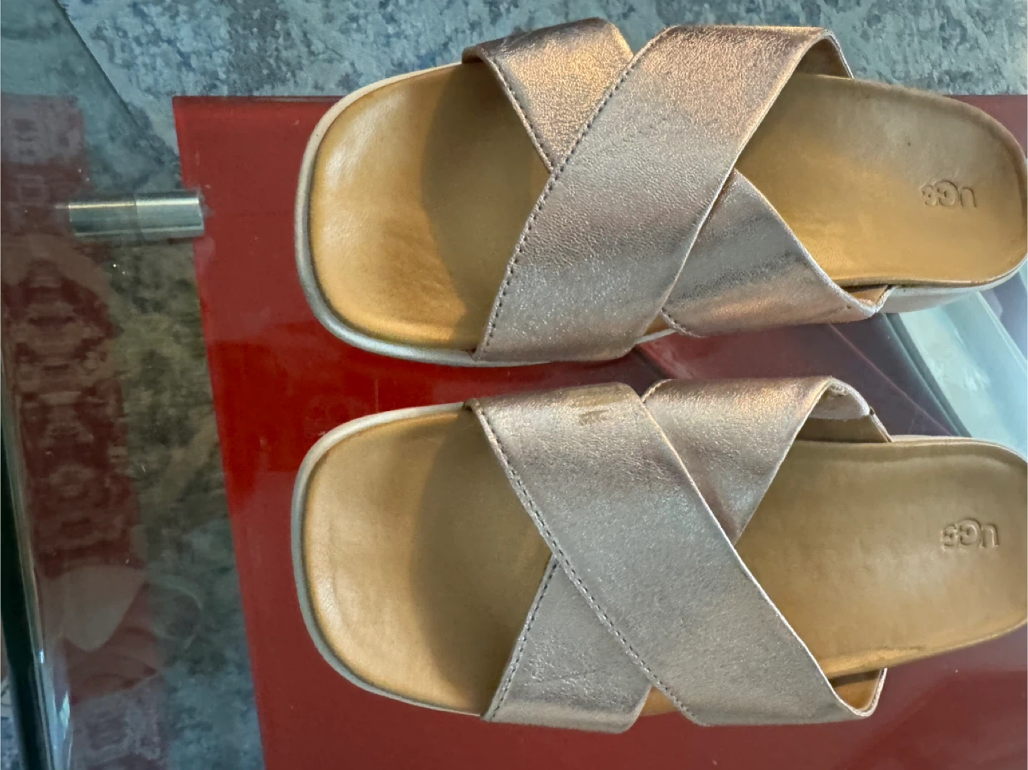 These are a pair of UGG sandals with a criss-cross design. They are a rose gold colour. A slight scratch on the inner side of one sandal.