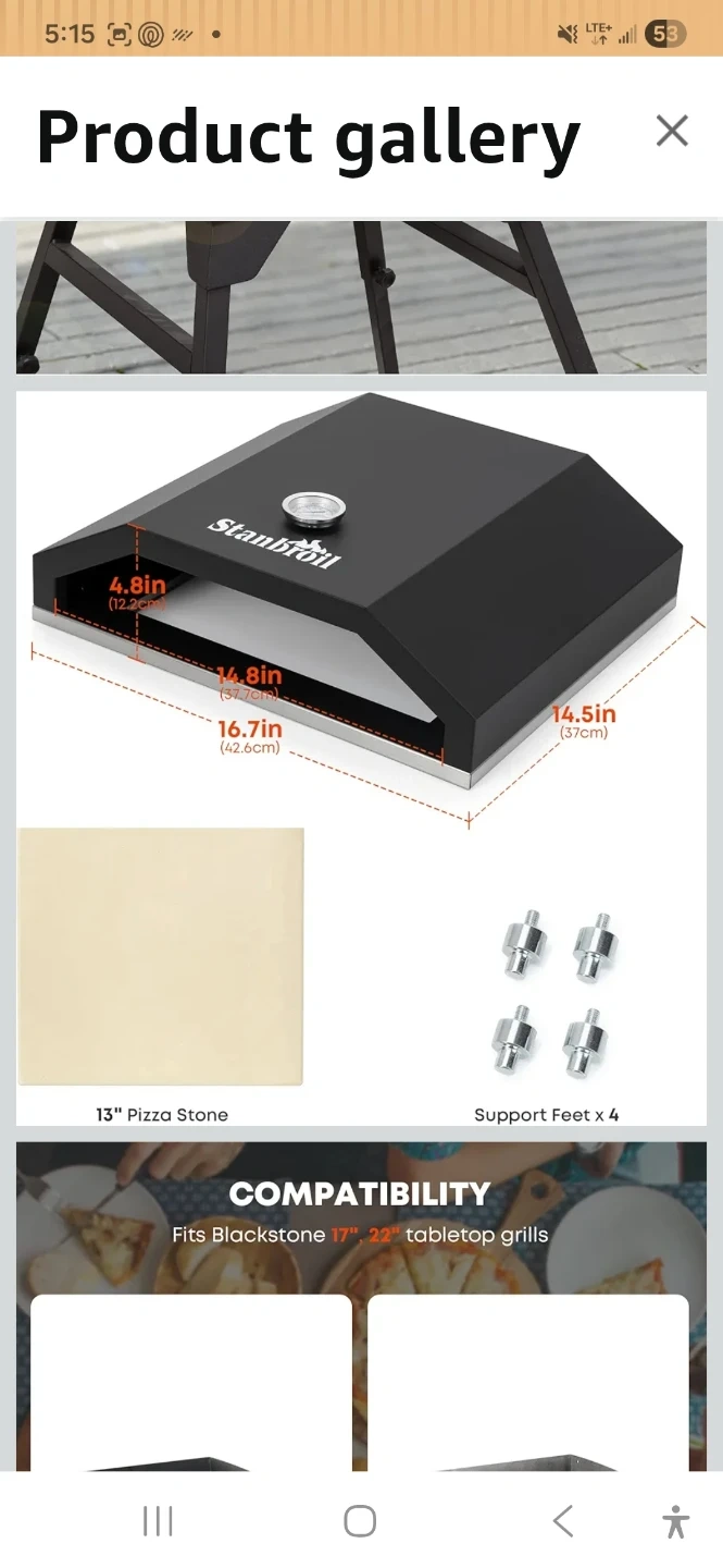 This Stanbroil pizza oven fits Blackstone 17" and 22" tabletop grills. It includes a 13" pizza stone and four support feet. The oven's main body dimensions are 16.7in x 14.5in x 4.8in.
