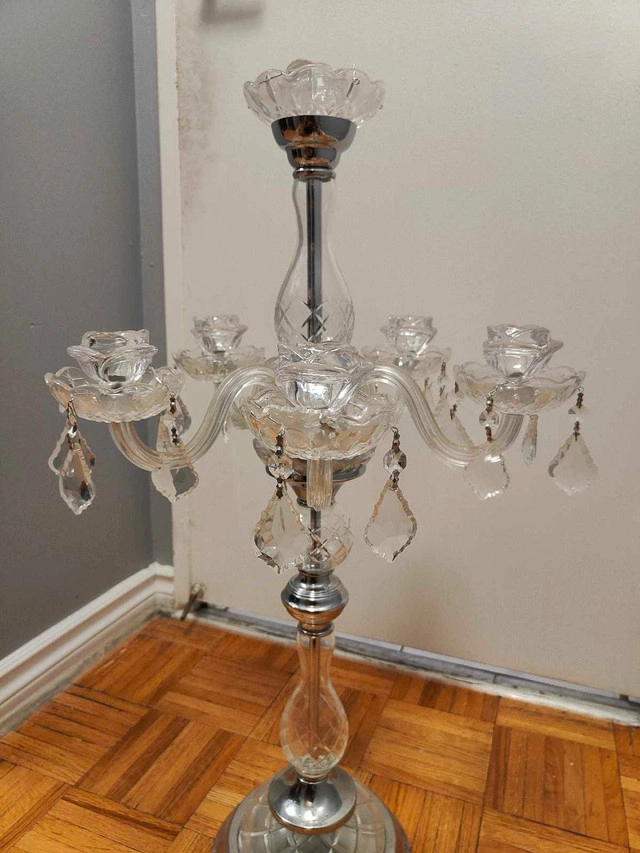 Add a touch of elegance to any room with this used crystal candle holder, designed to hold five candles and enhance your decor. The crystal droplets catch the light beautifully. Specifications: * Type: Candle Holder * Material: Crystal, Metal * Style: Elegant * Candle Capacity: 5 Looking to add a bit of sparkle? This is the piece! If the ad is up, it's still available!