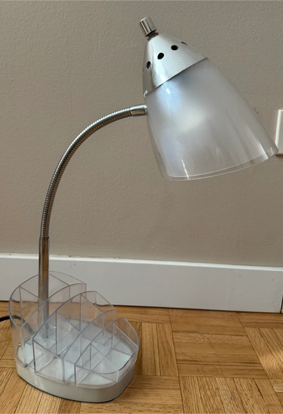 This desk lamp features a flexible gooseneck and a frosted shade for diffused lighting. It's got a handy organizer base with multiple compartments. A bulb is included and it's plugged in and working fine! Great for a workspace or bedside table.