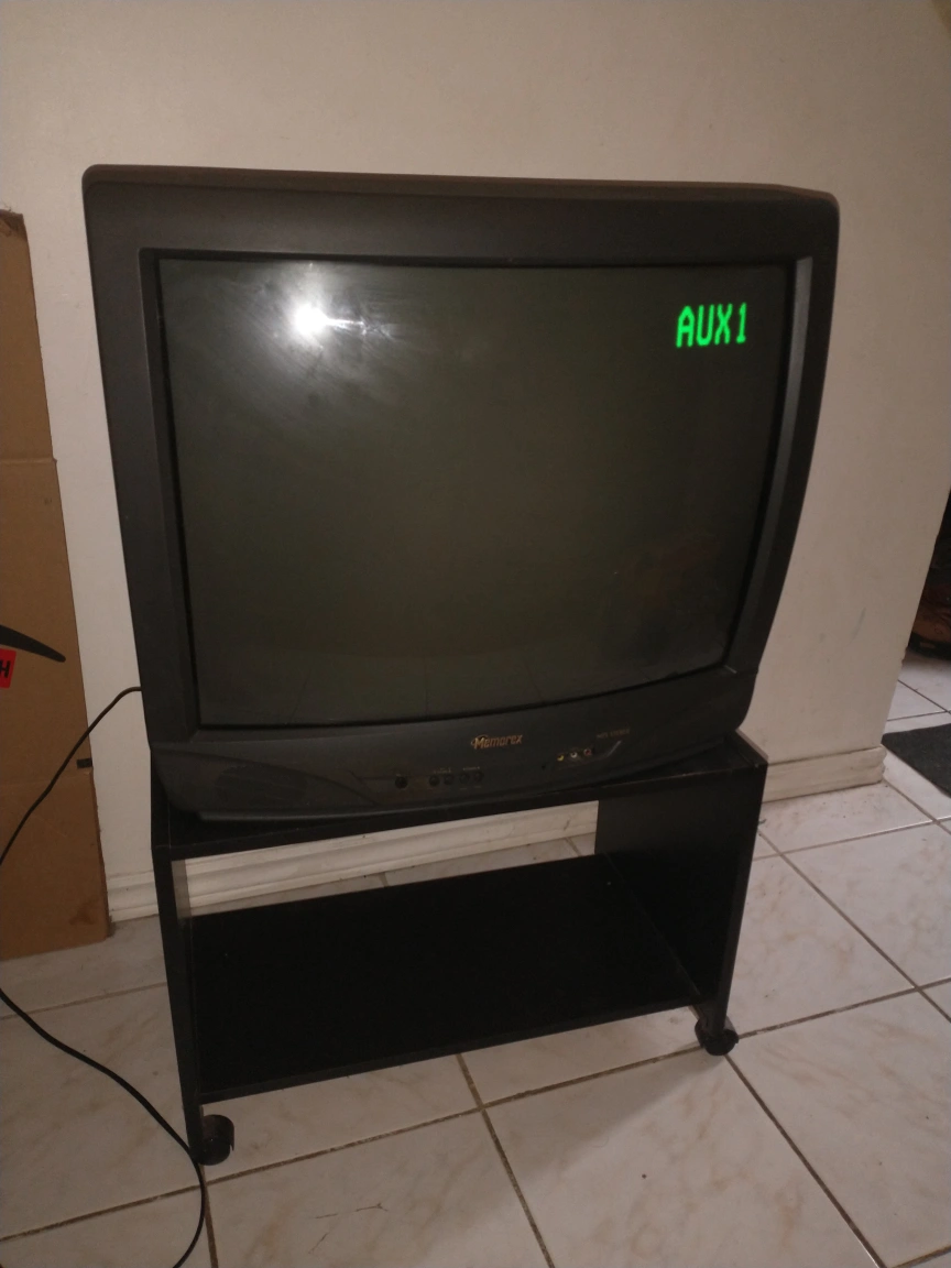 Memorex Stereo television with rolling stand.