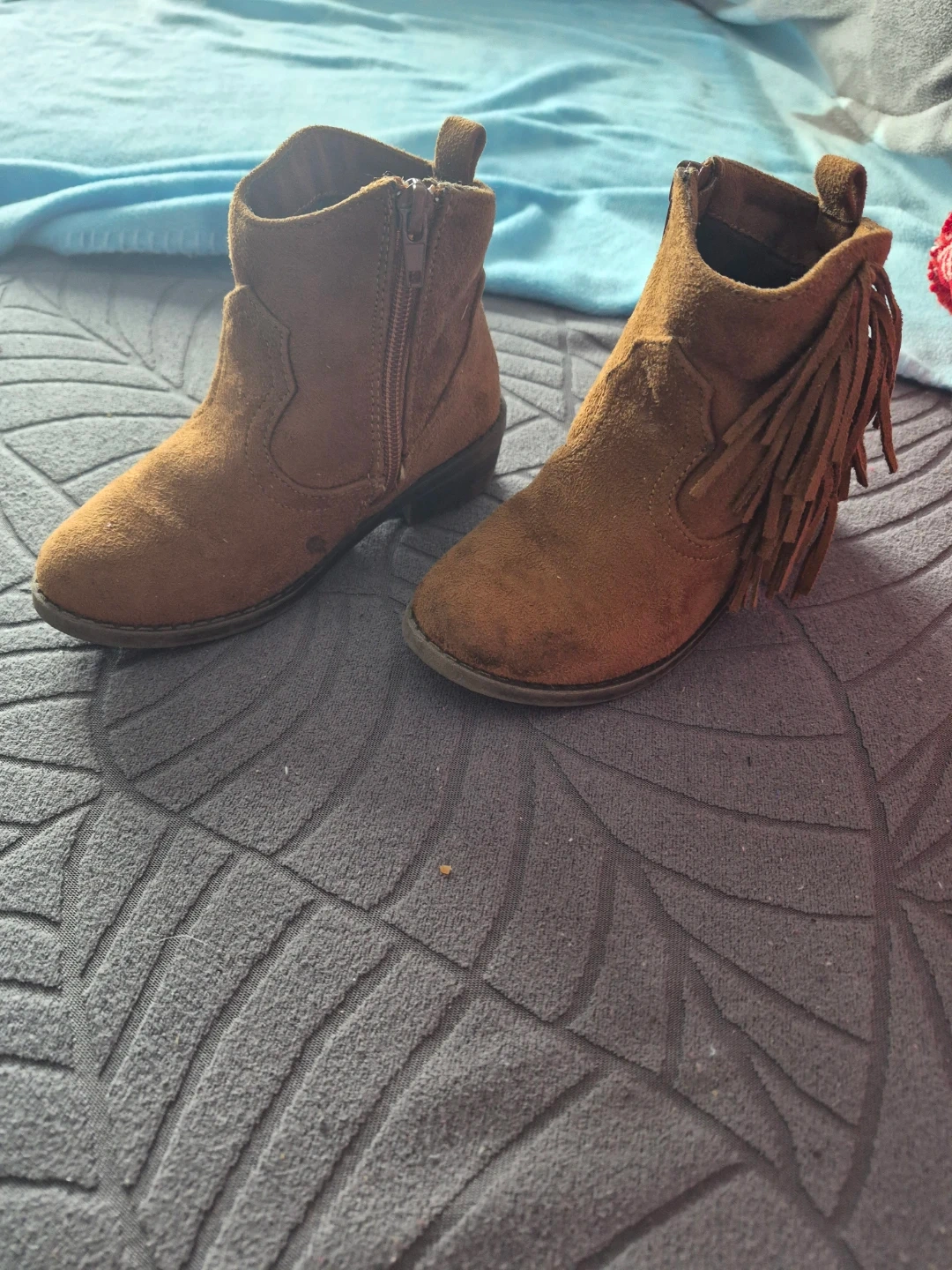 These cute brown ankle boots feature a faux suede material and decorative fringe on one side. They have a zipper closure for easy on and off. Size is 11.