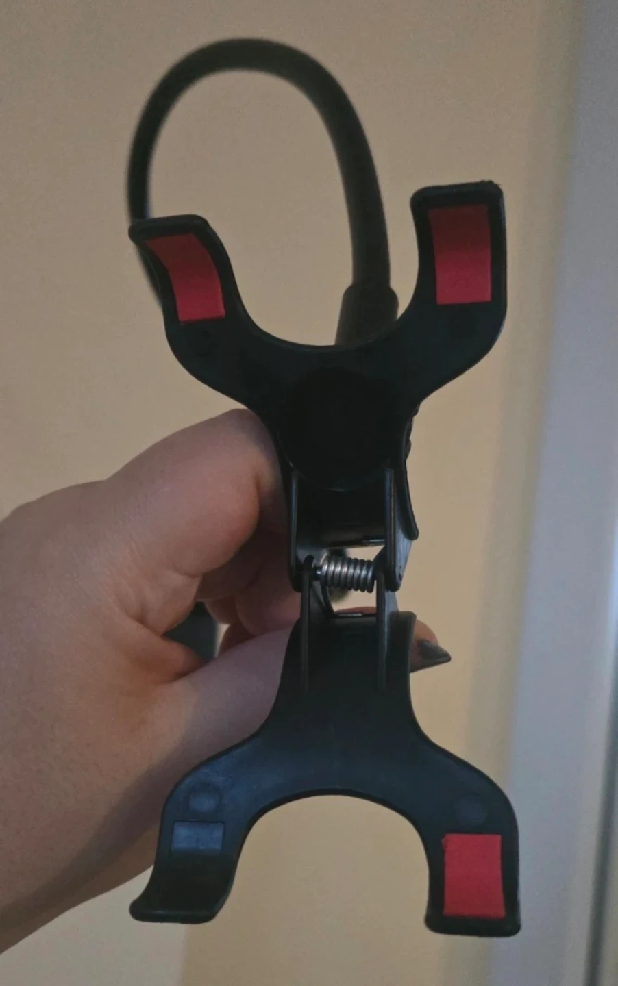 This clip-on phone holder features a flexible gooseneck arm. It clamps onto surfaces securely and holds your phone in place. Great for hands-free viewing at different angles!