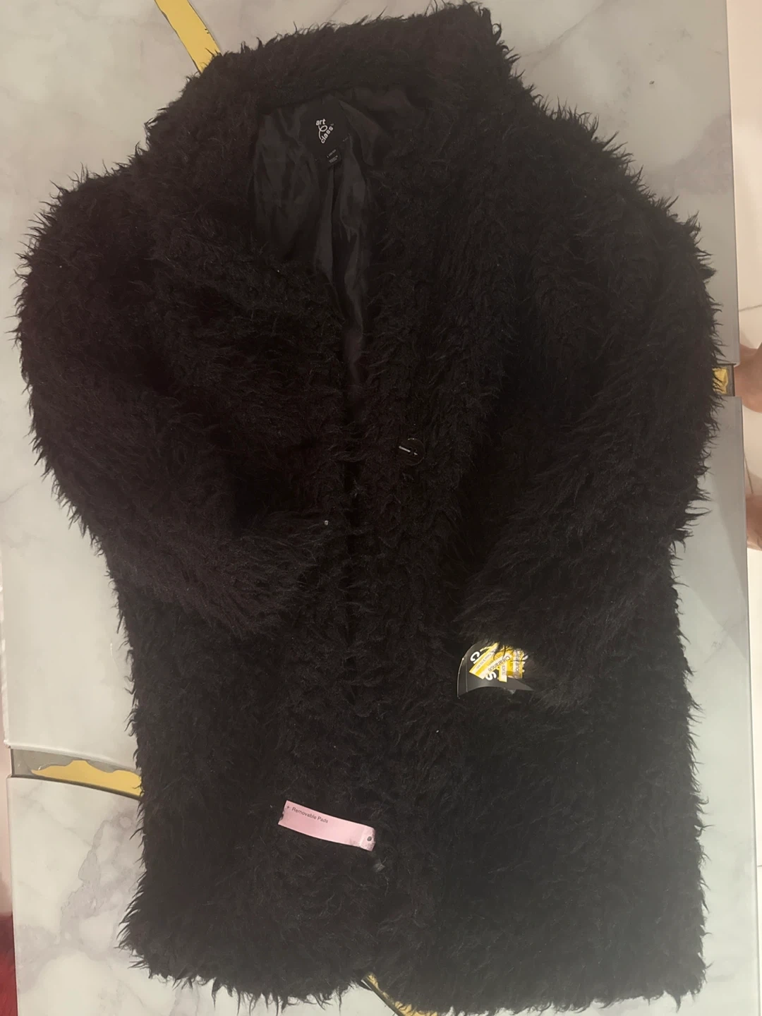 This is an Art Class black faux fur coat. It's a size L, fitting 10/12. The coat has removable pads. It's made of faux fur and has a button closure.
