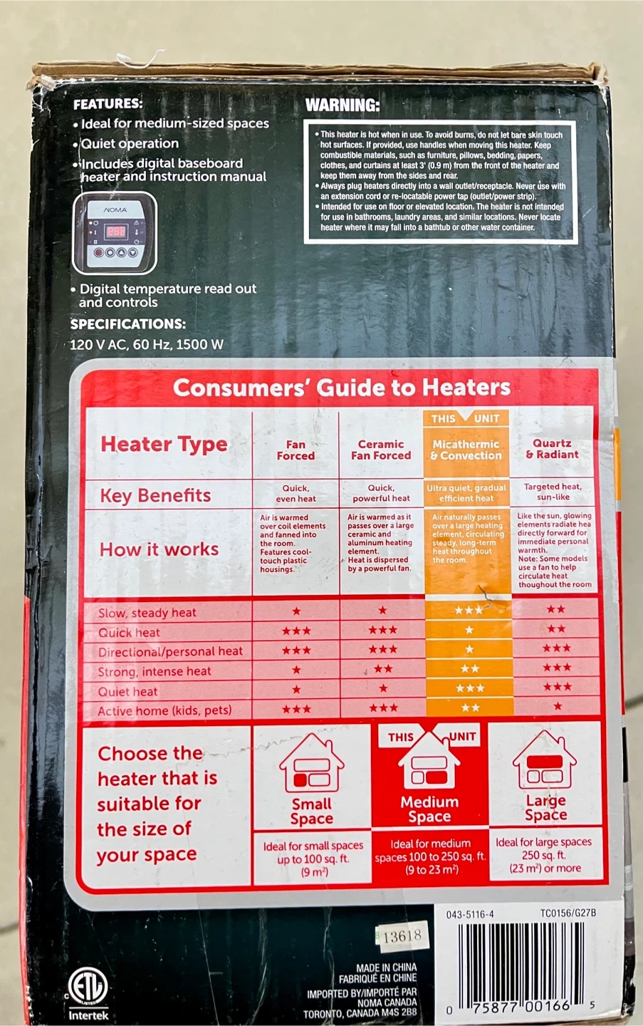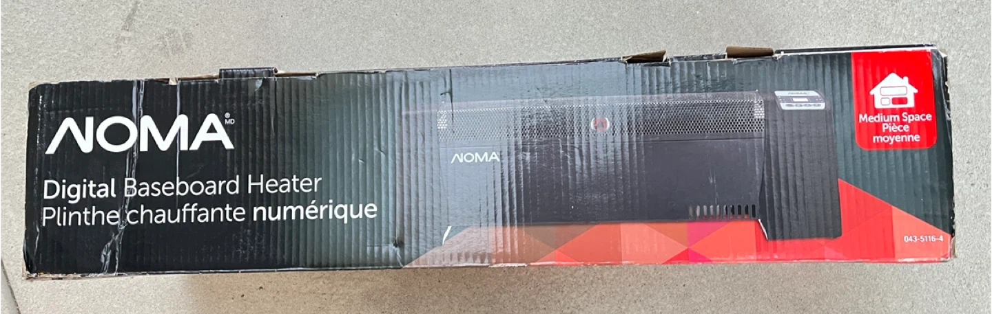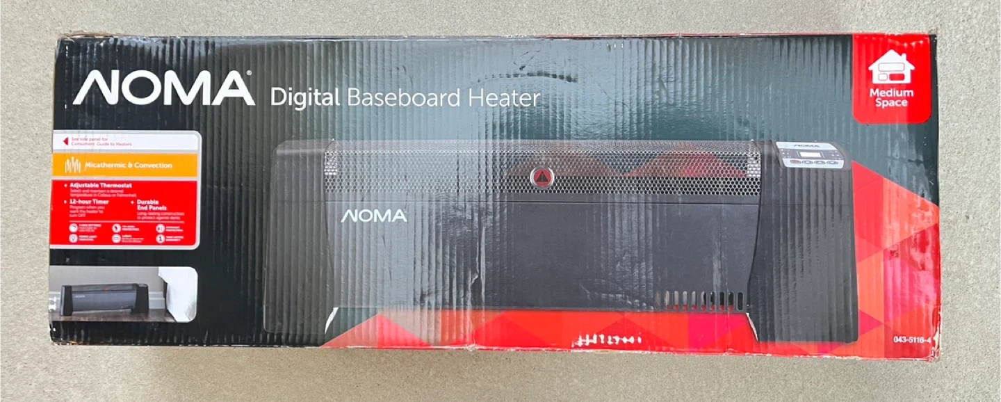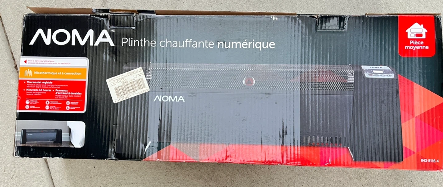 Selling a brand new NOMA digital baseboard heater, still in its original box! It's perfect for medium-sized spaces and features an adjustable thermostat and a 12-hour timer. This heater offers micathermic heating and connection for efficient and durable warmth