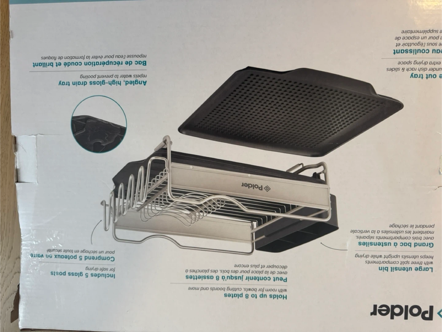 This Polder dish rack is made of Advantage Aluminum and includes a large utensil bin. It holds up to 8 plates and comes with 5 glass posts for safe drying. It also features an angled, high-gloss drain tray.