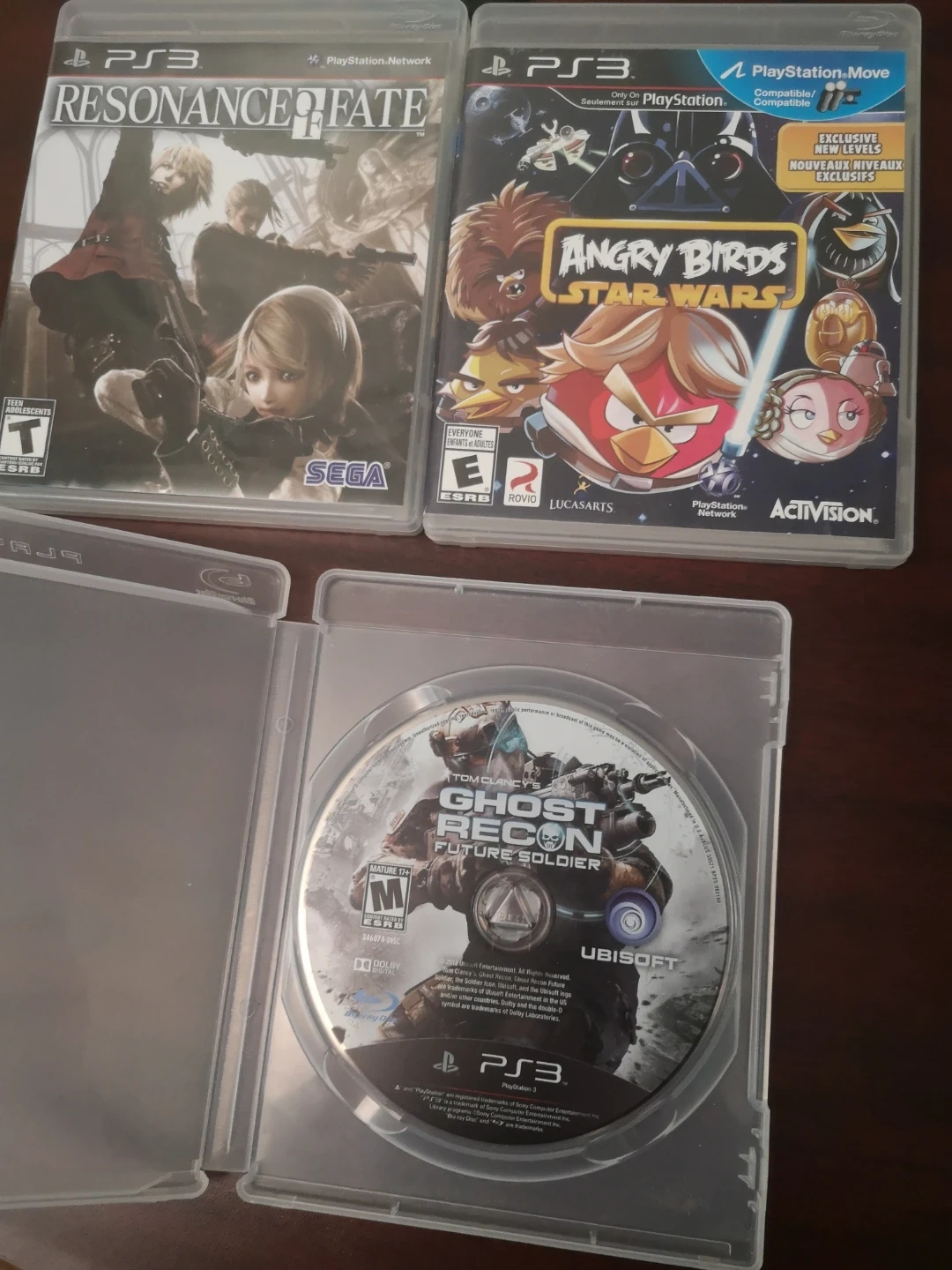 Three PlayStation 3 video games included are Resonance of Fate, Angry Birds Star Wars, and Tom Clancy's Ghost Recon Future Soldier. All discs are for the PS3 console. All discs work great.