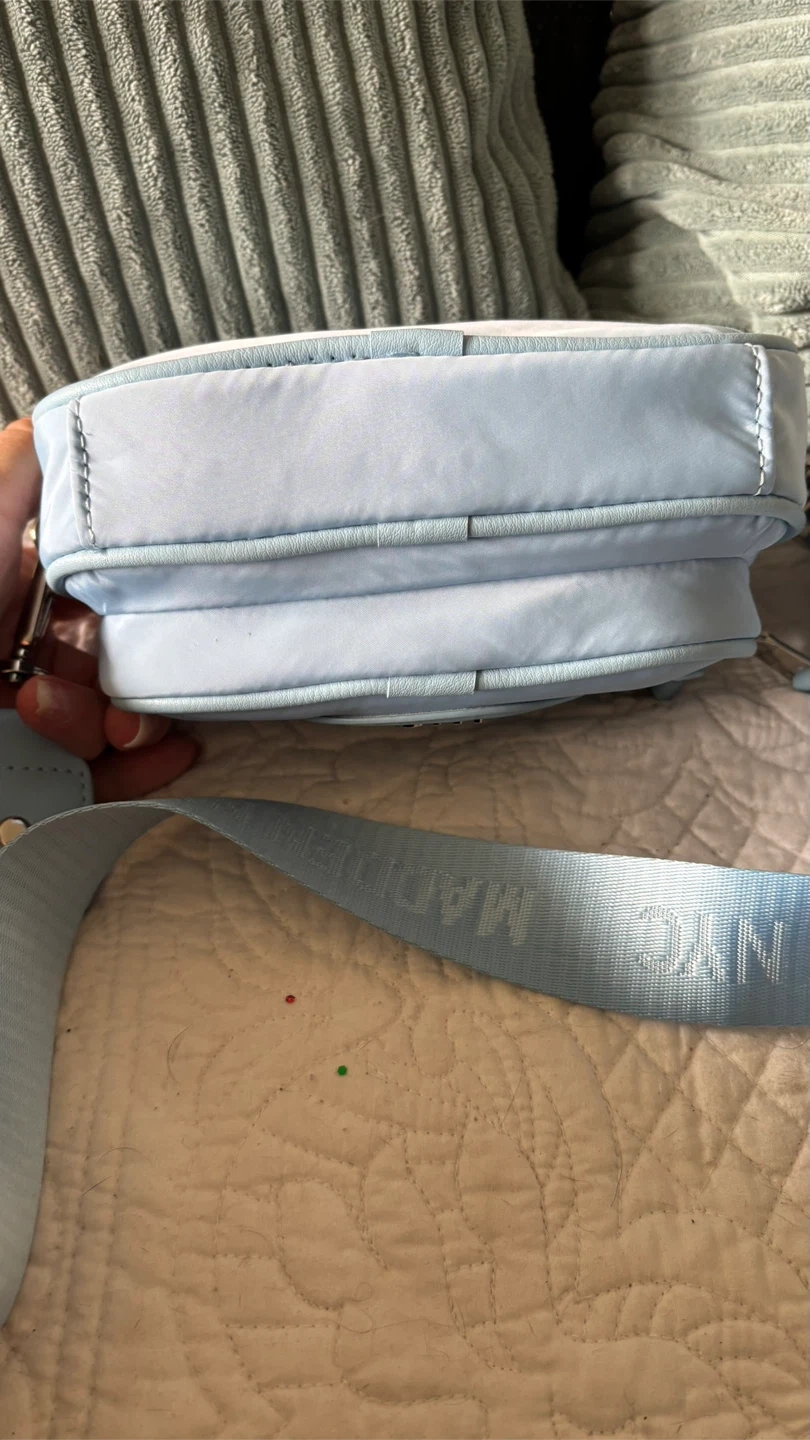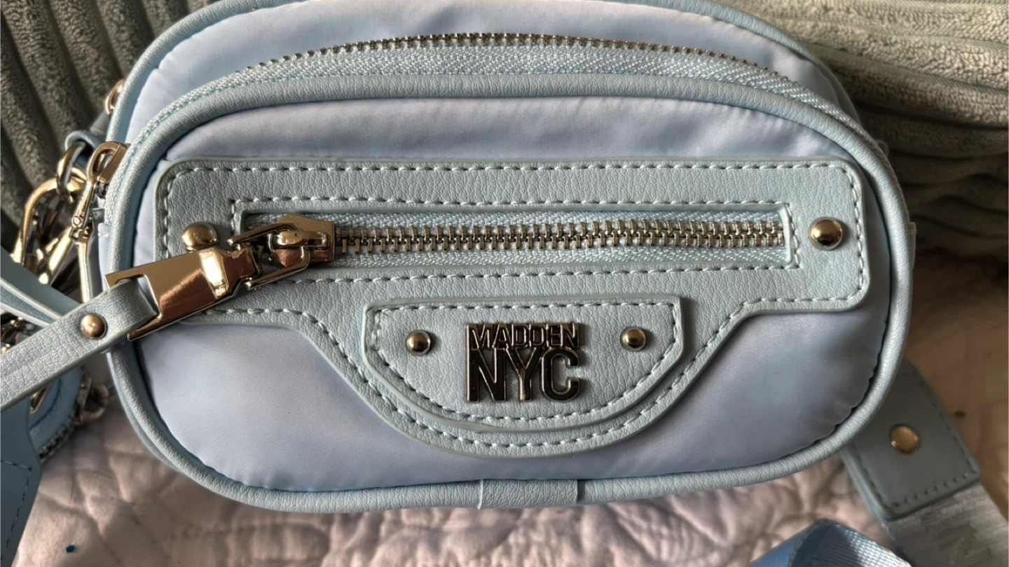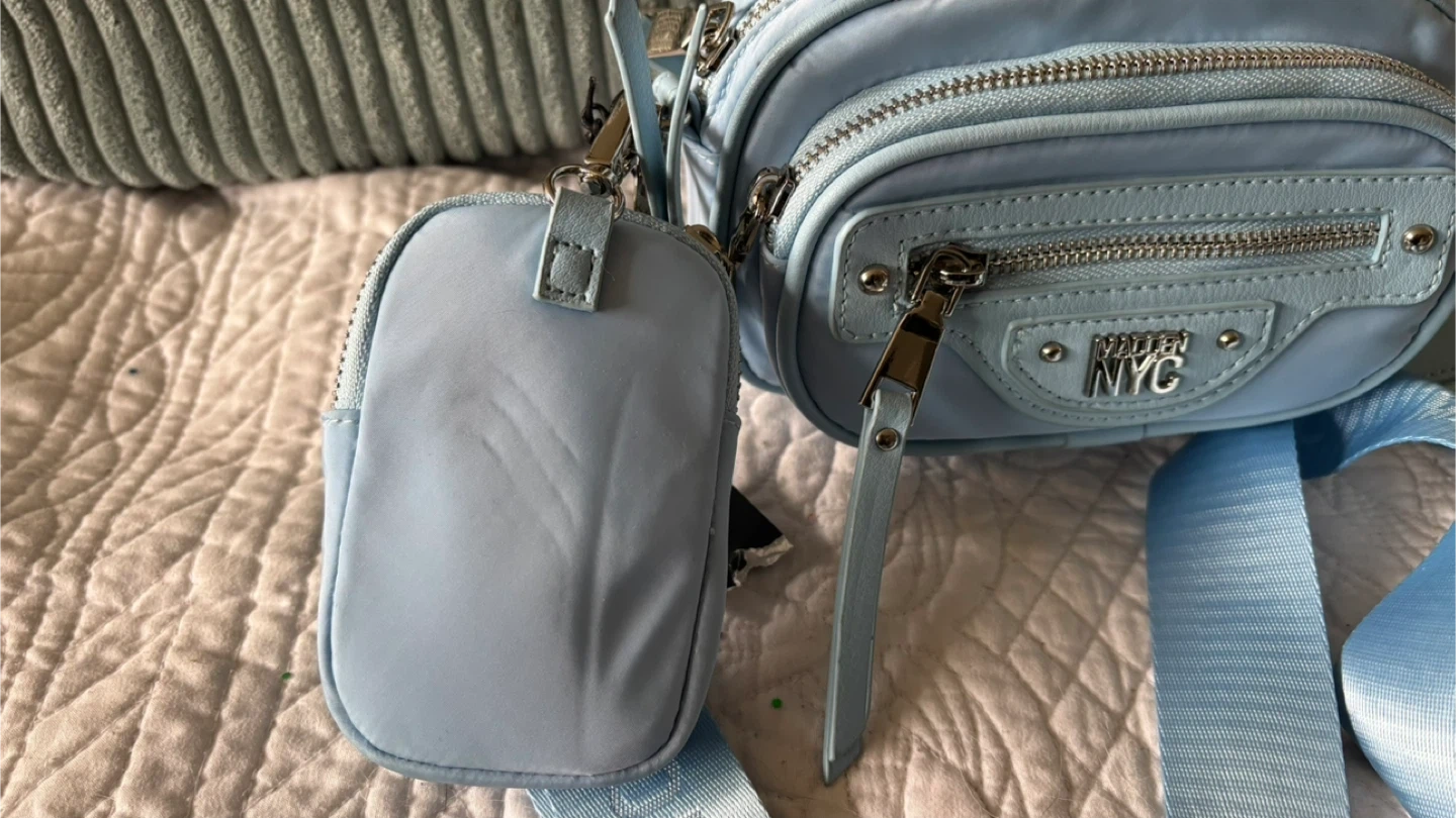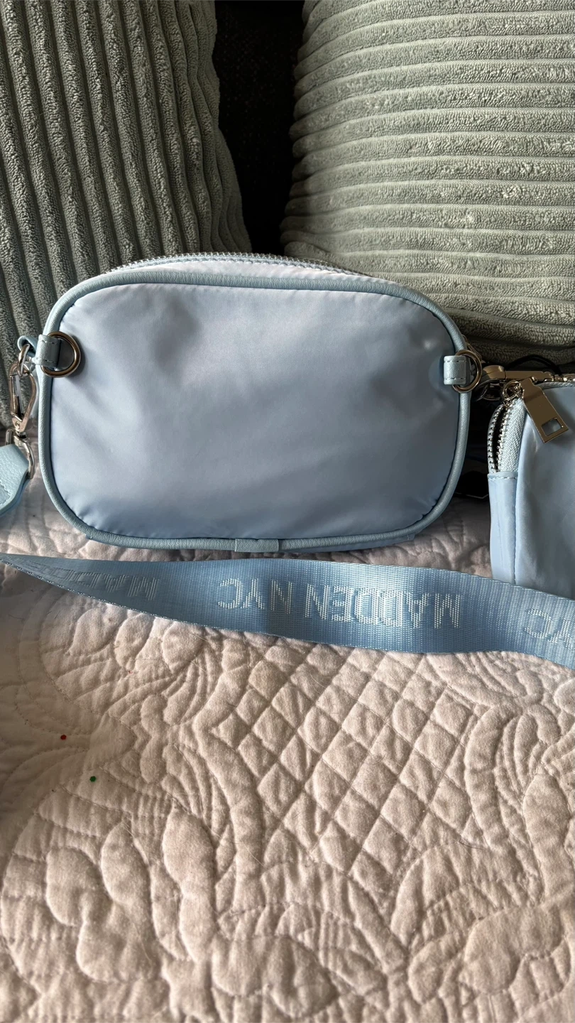 Light blue crossbody bag from Steve Madden NYC. It's made of nylon material. Comes with a matching detachable pouch. Perfect for carrying essentials! Also changes into a waist bag.