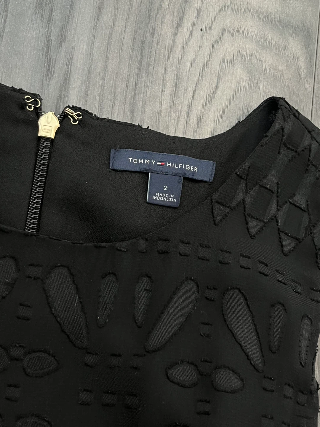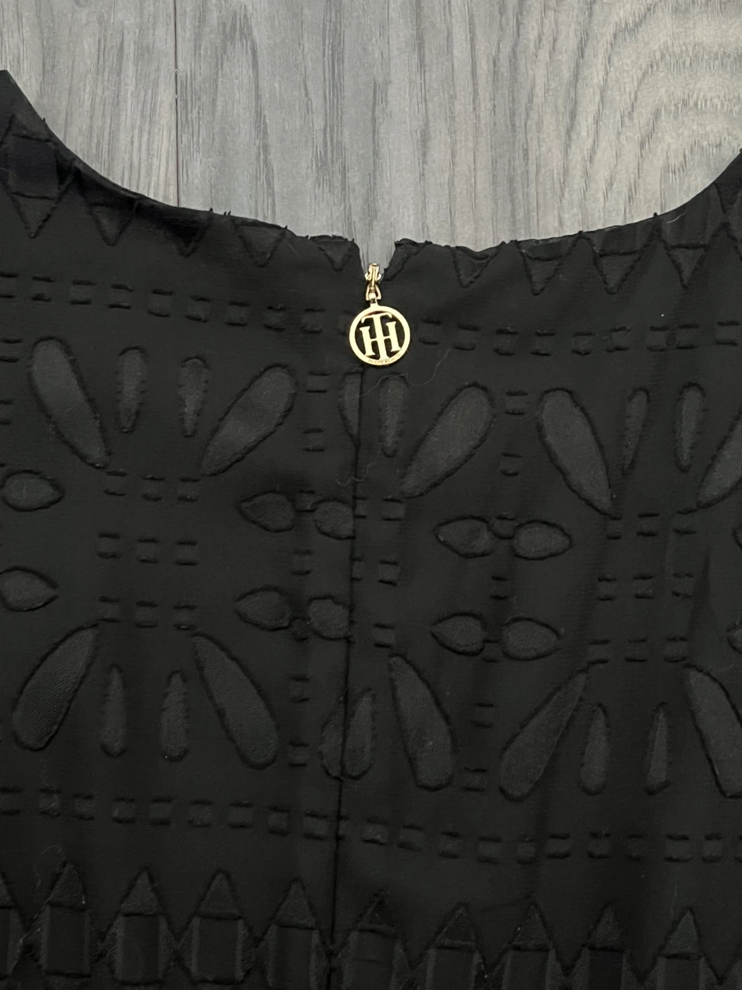 Tommy Hilfiger intricate floral-like designed black dress. Back zipper closure with "H" logo gold zipper. Great condition, no damage.