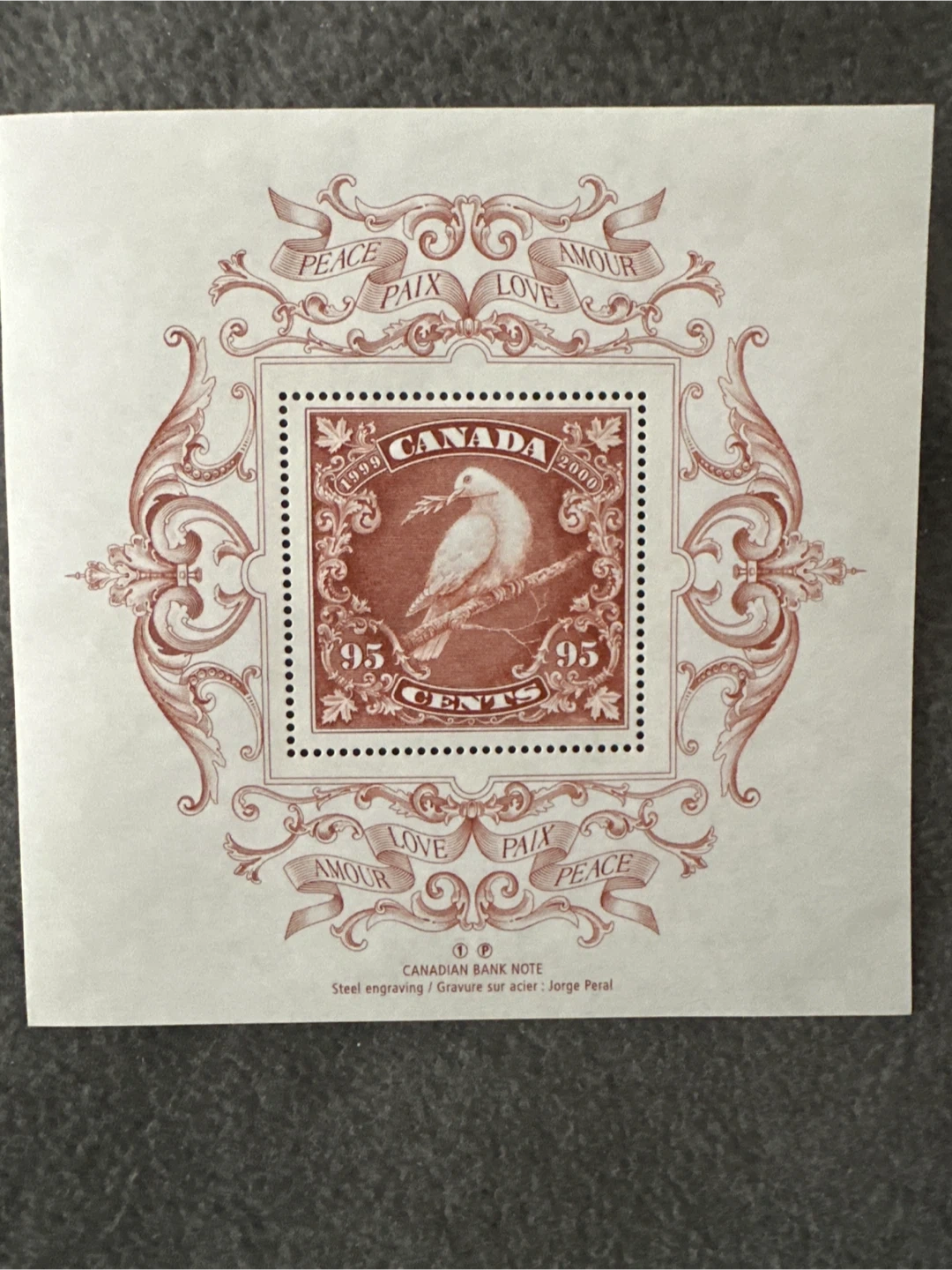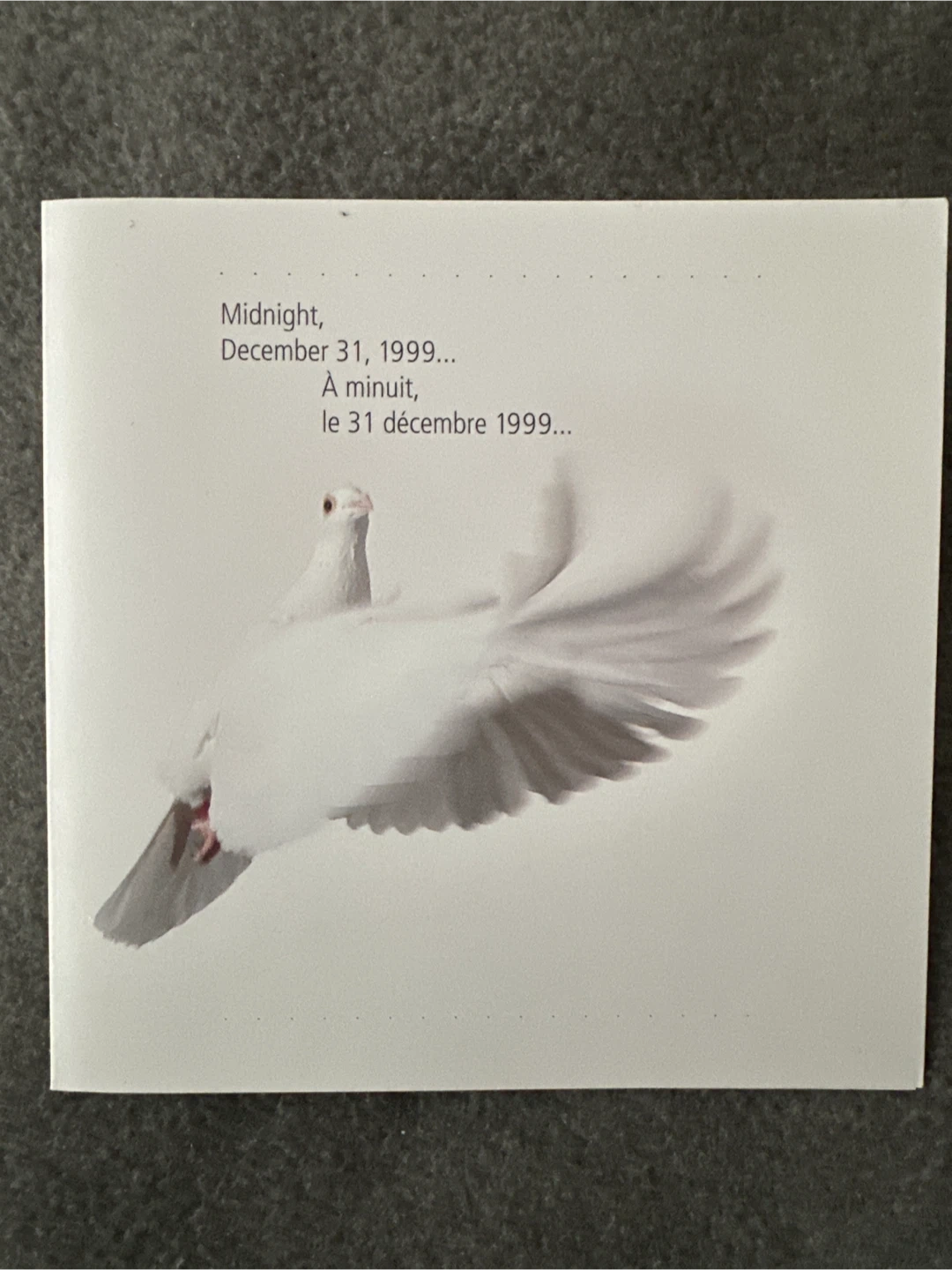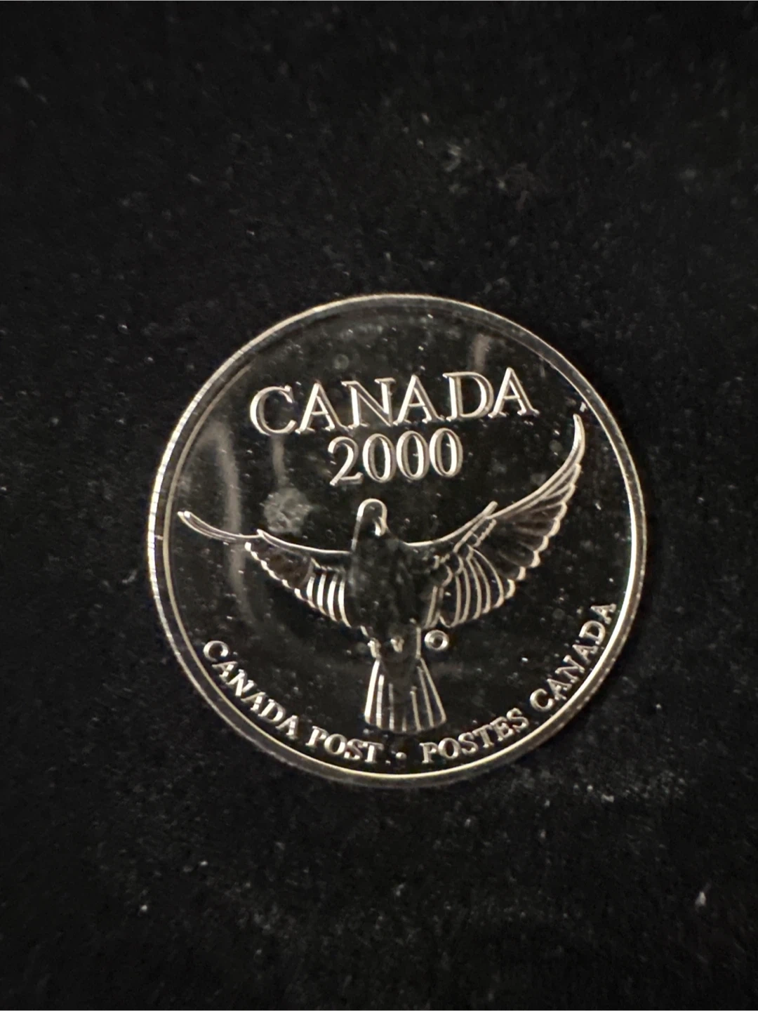 This is a 1999 Royal Canada Mint limited edition Millenium medallion in an exquisitely crafted metal box. The package features an embossed dove design on the lid, and includes mint postage stamps. Postcard included, as well as original Blue Dove cover.
