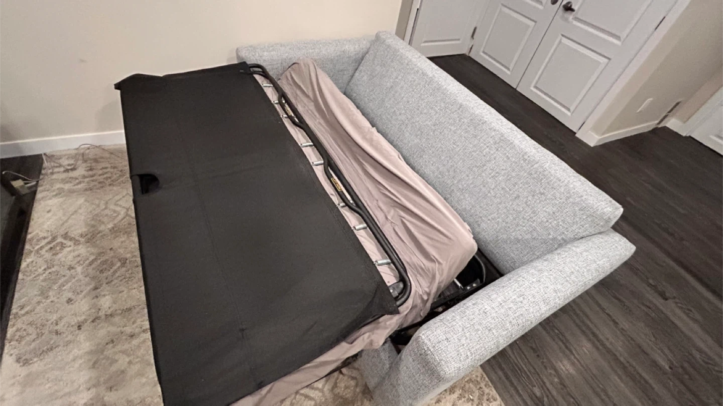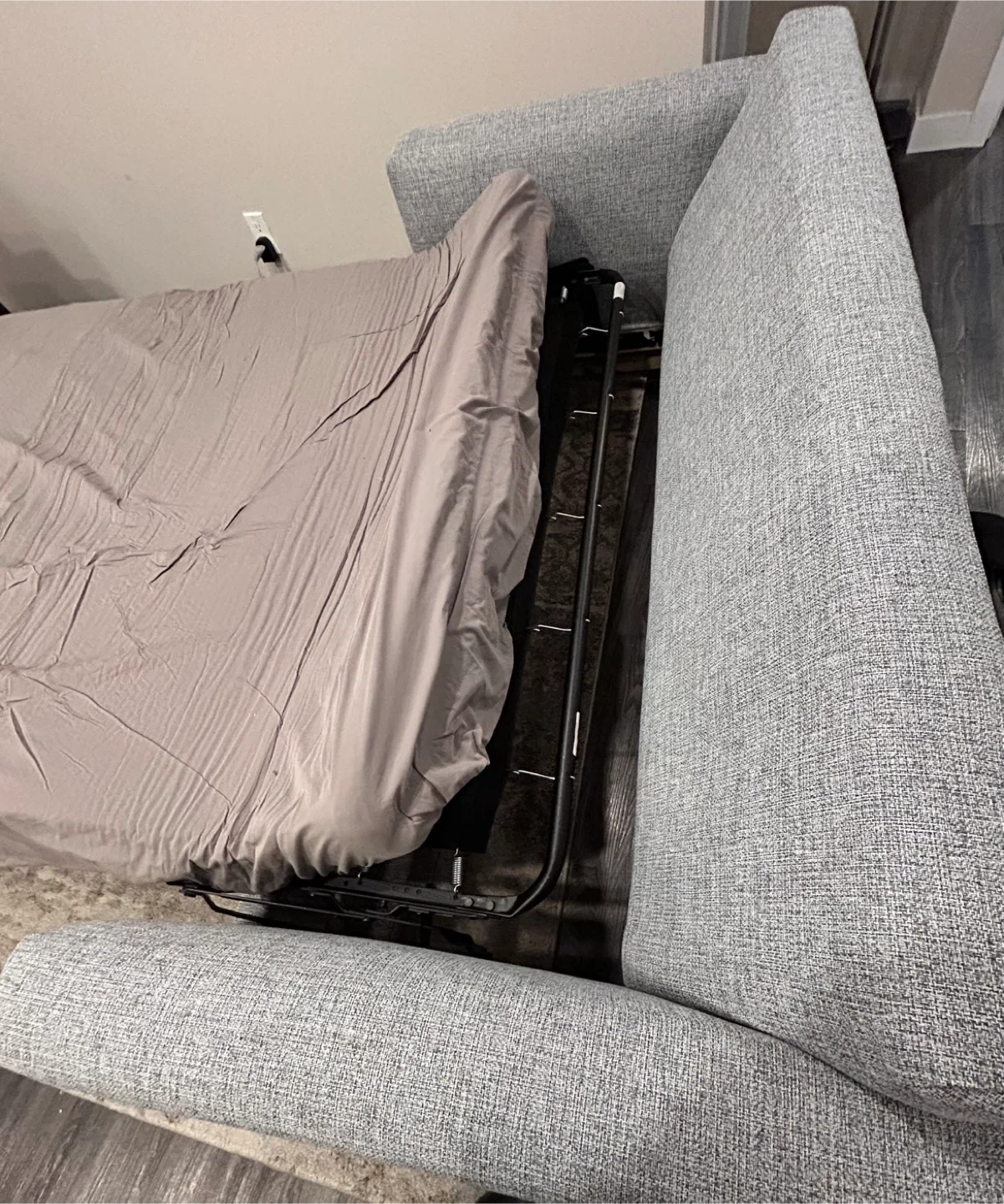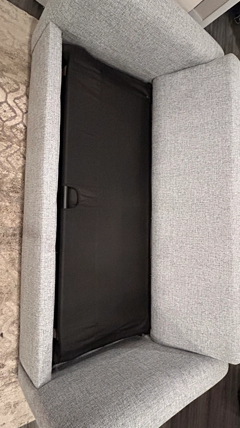 A grey sofa with a double pull-out mattress frame. Perfect for small spaces needing extra sleeping arrangements, simple to use, easy to set up and fold back, in great shape. Priced to sell fast.