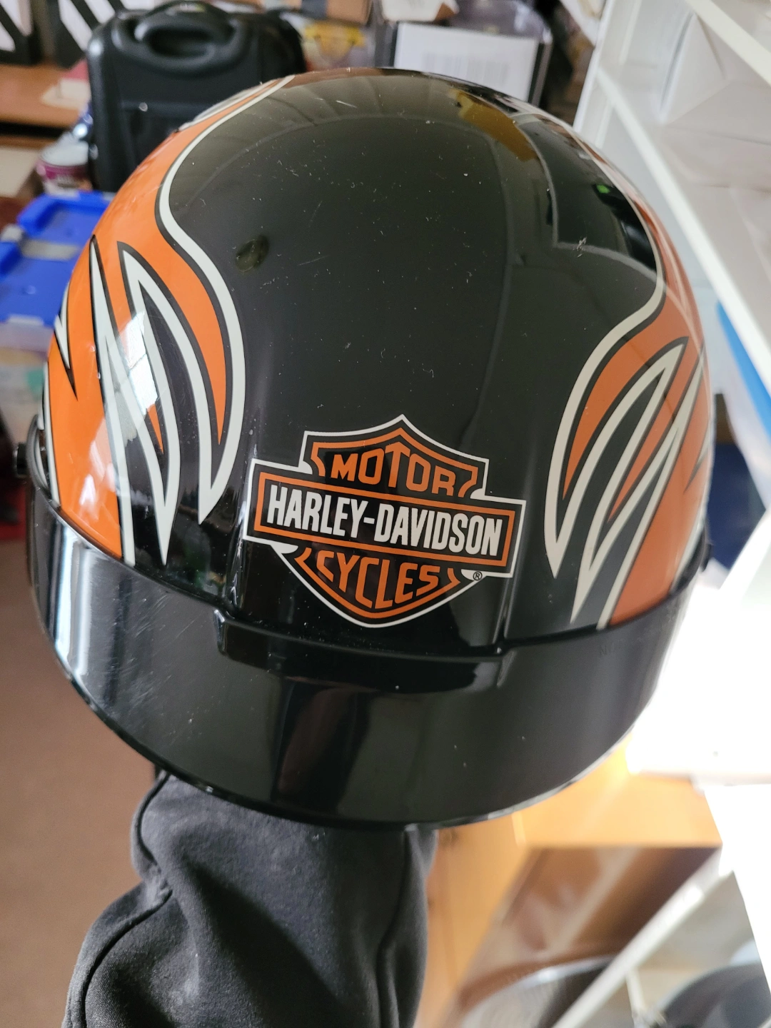 Black Harley-Davidson helmet. Orange and white flames design. DOT approved. Size medium. Like New condition.