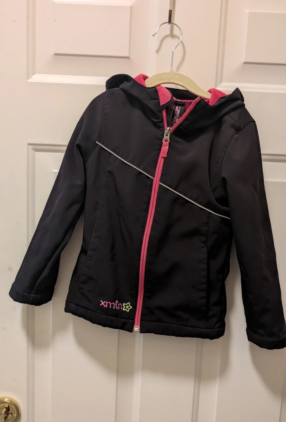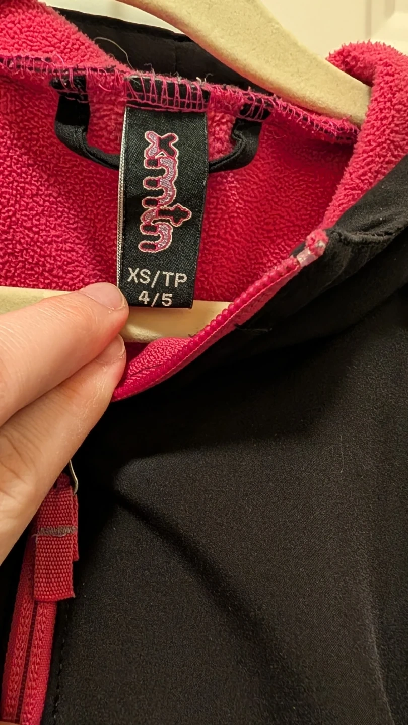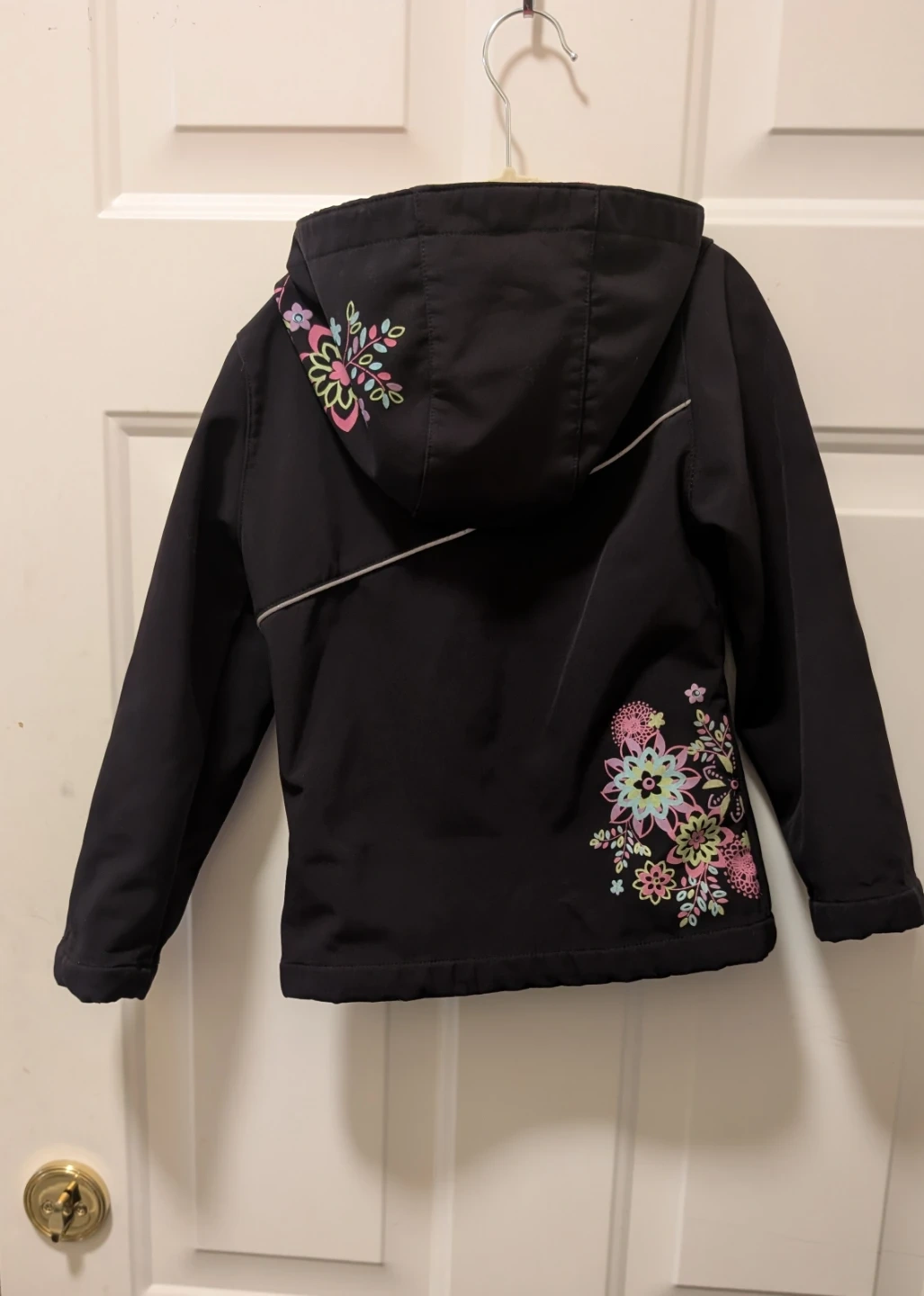 This is a black softshell jacket from X-treme. It has a pink fleece lining and colourful floral embroidery on the back and front. Size is XS/TP, which fits a 4/5.