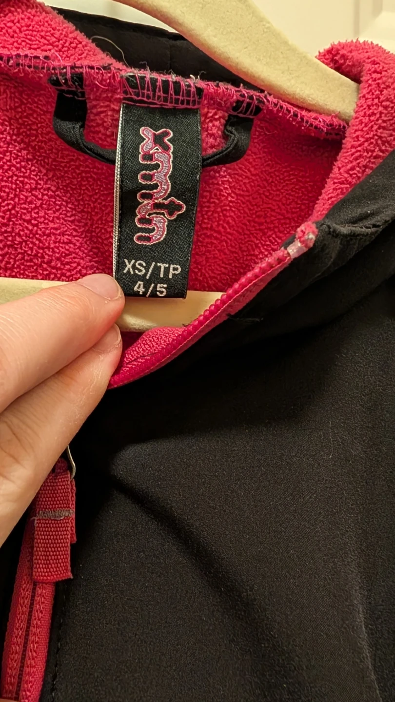 This is a black softshell jacket from X-treme. It has a pink fleece lining and colourful floral embroidery on the back and front. Size is XS/TP, which fits a 4/5.