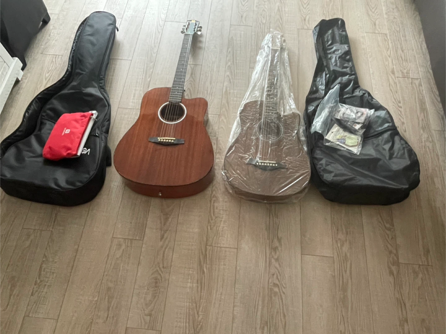 Acoustic guitar, Size 38”, still in its original packaging. It comes with a case for easy transport and storage. Great for beginners or experienced players. Kit W/Nylon Bag Tuner Picks 6 Steel Strings Capo Cloth Strap Winder. Chocolate