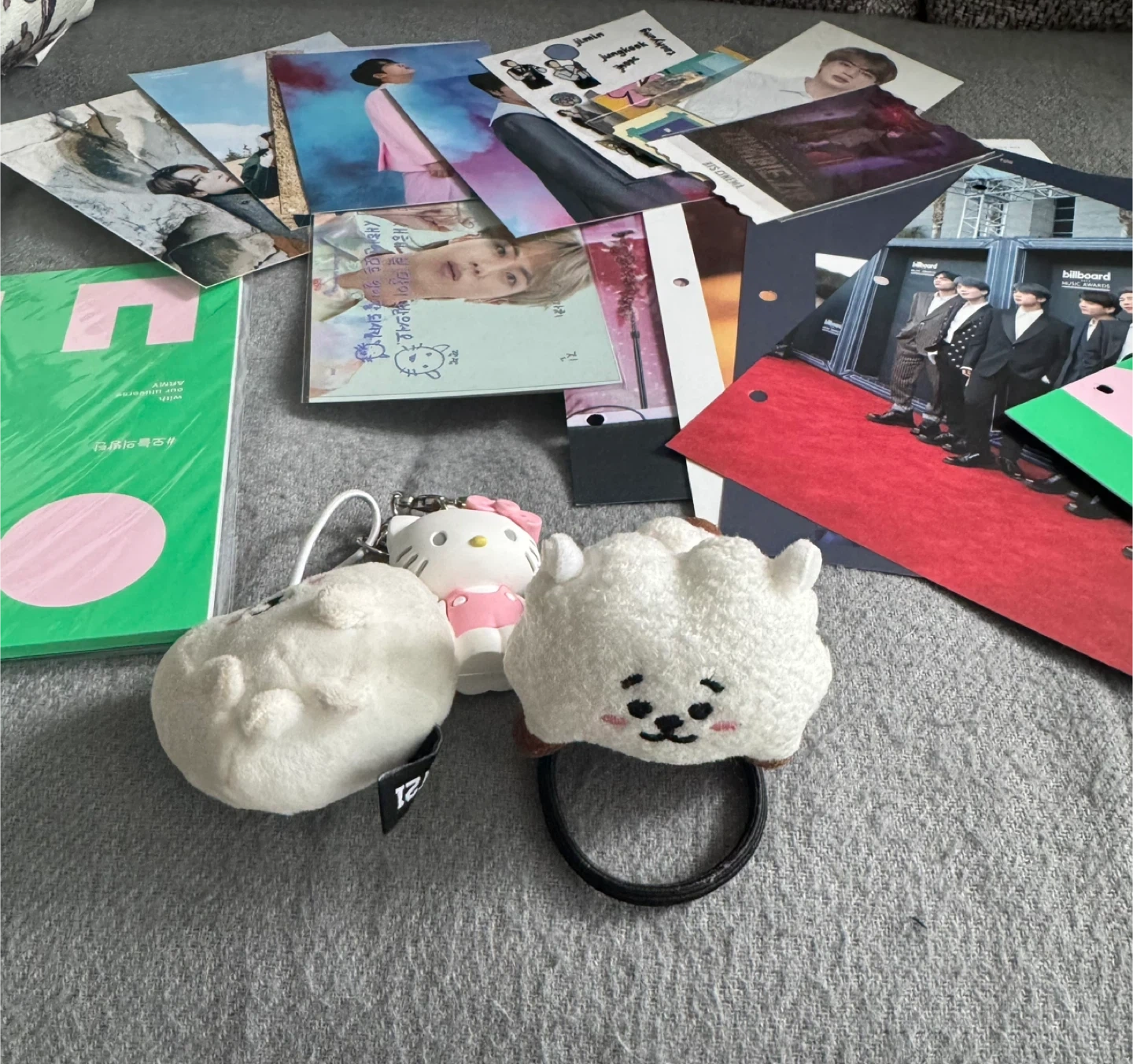 Giving away a various BTS pictures, photocards, a Hello Kitty keychain, and two RJ plush keychain & hair tie.