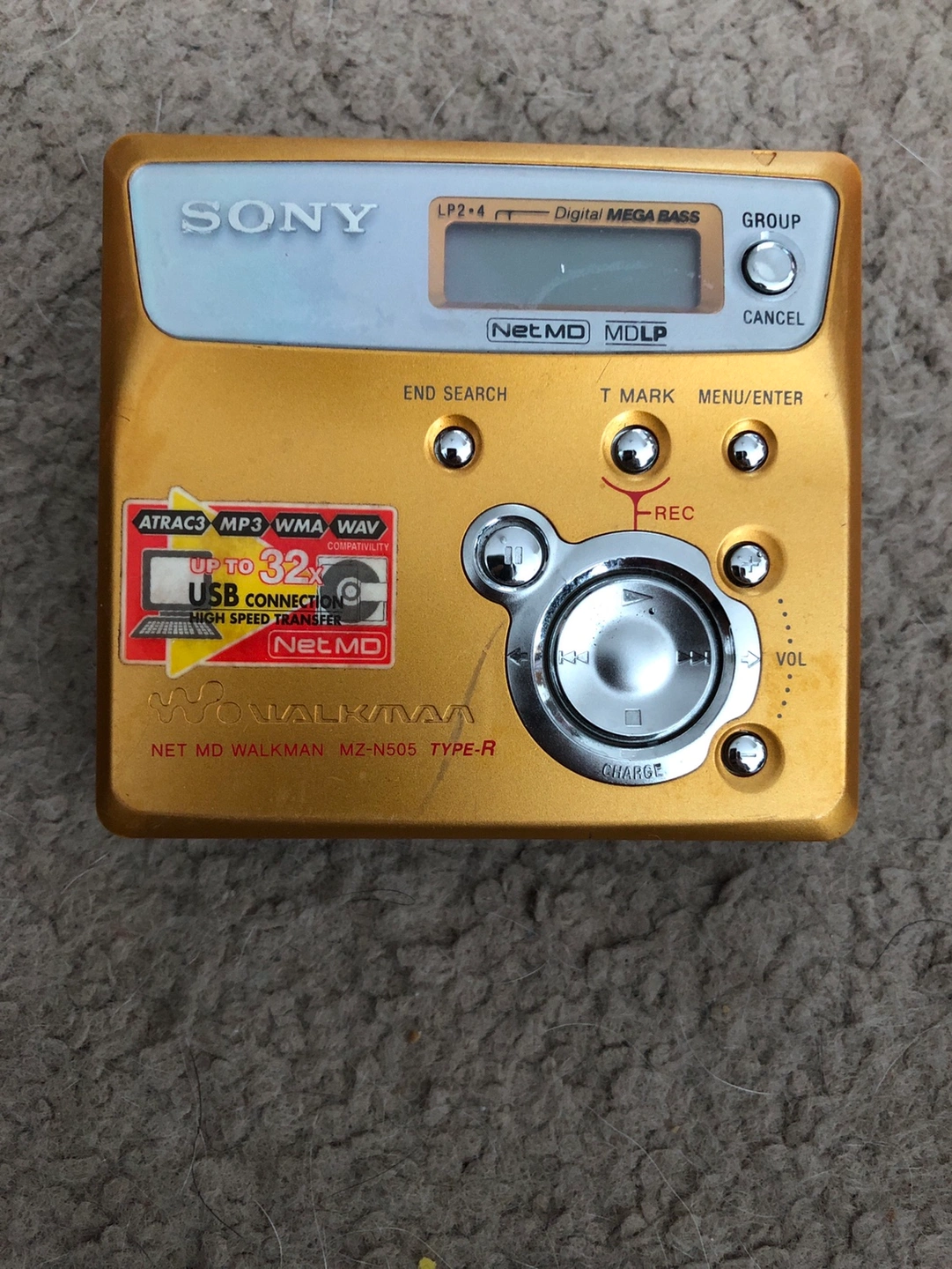 Gold Sony Net MD Walkman MZ-N505 with USB connectivity. This player is compatible with ATRAC3, MP3, WMA, and WAV files. It includes a built-in rechargeable battery and can be charged using the included USB cable. This player also has a headphone jack. Tested and works.