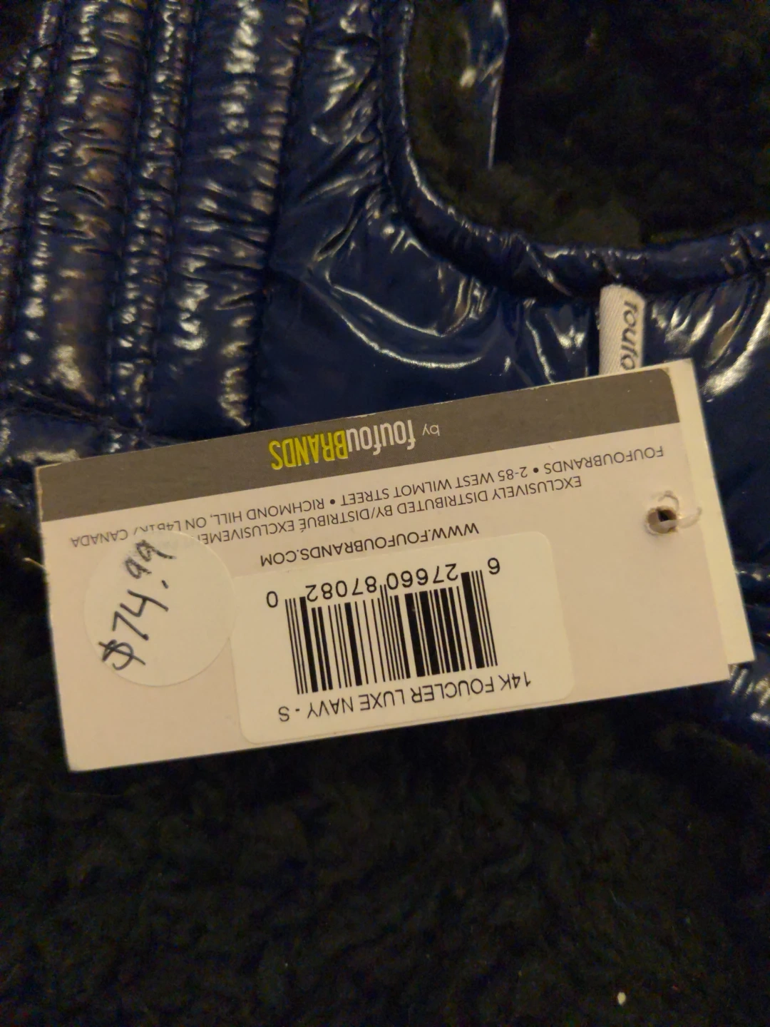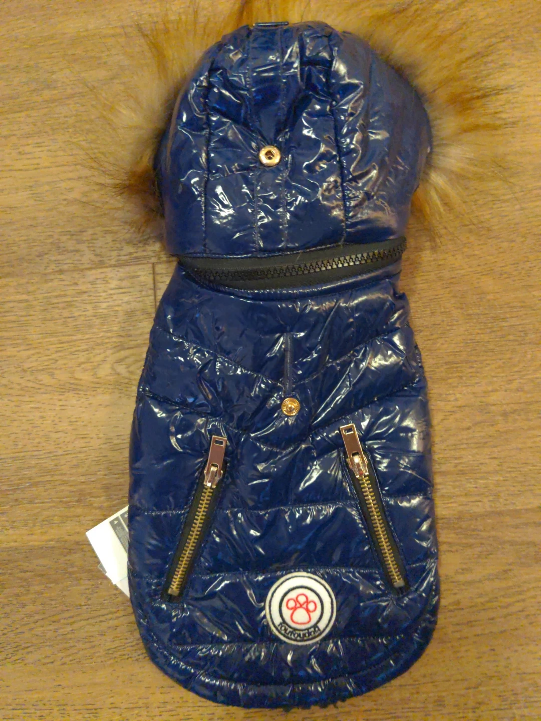 This navy blue puffy dog jacket is a size small. It features a shiny, water-resistant outer shell and a soft, furry lining. It has a hood with faux fur trim and zippered pockets. Designed in Canada, it's perfect for keeping your canine companion warm and stylish during cooler weather!