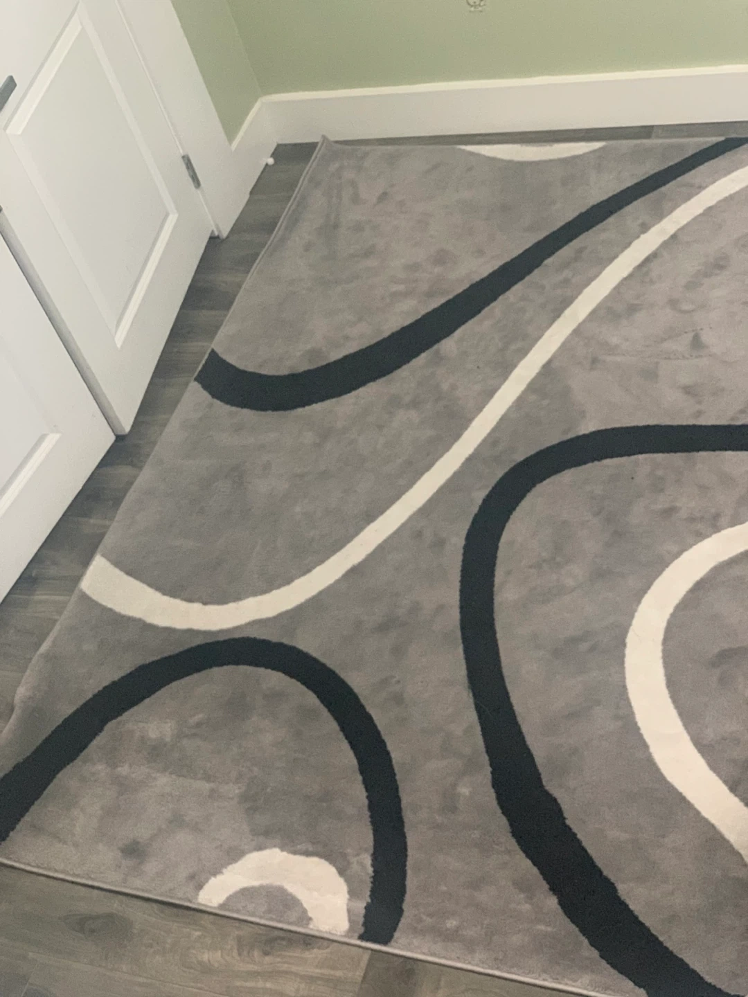 Area rug with a modern design featuring black and white curved lines on a grey background. It's in great shape and would look lovely in any room