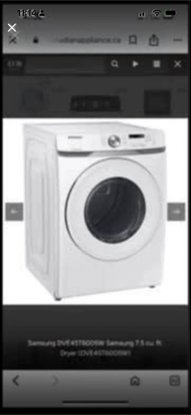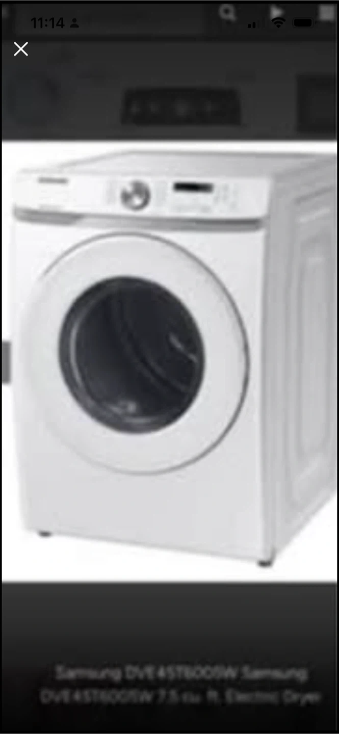 This is a white Samsung 7.5 cu ft electric dryer. Model DVE45T6000W. It's a front-load dryer, New Samsung 4.5 Cu Ft Washer