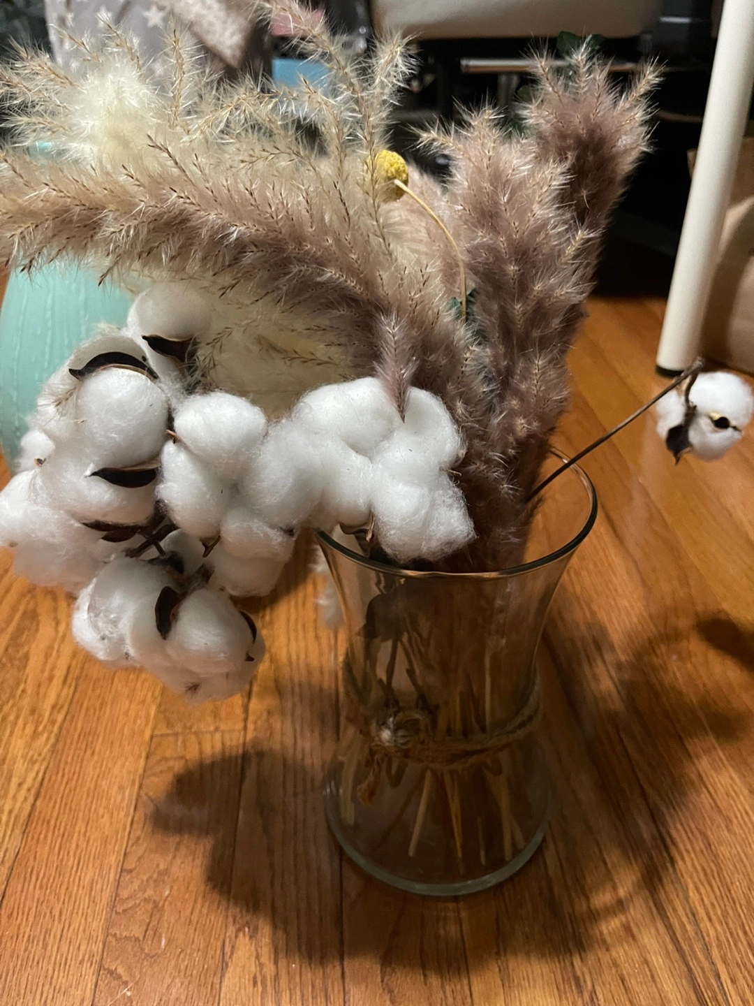 Beautiful dried floral arrangement. Features pampas grass, cotton stems, and other dried plants. Arranged in a clear glass vase. Perfect autumn decor.