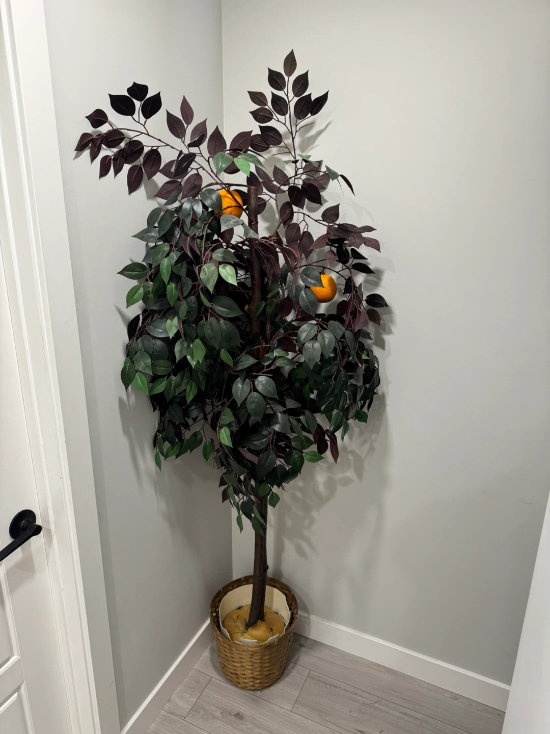 Here's a lovely artificial orange tree in a basket! It's perfect for adding a touch of greenery to any room without the hassle of maintenance. The oranges add a pop of colour and the basket gives it a rustic charm