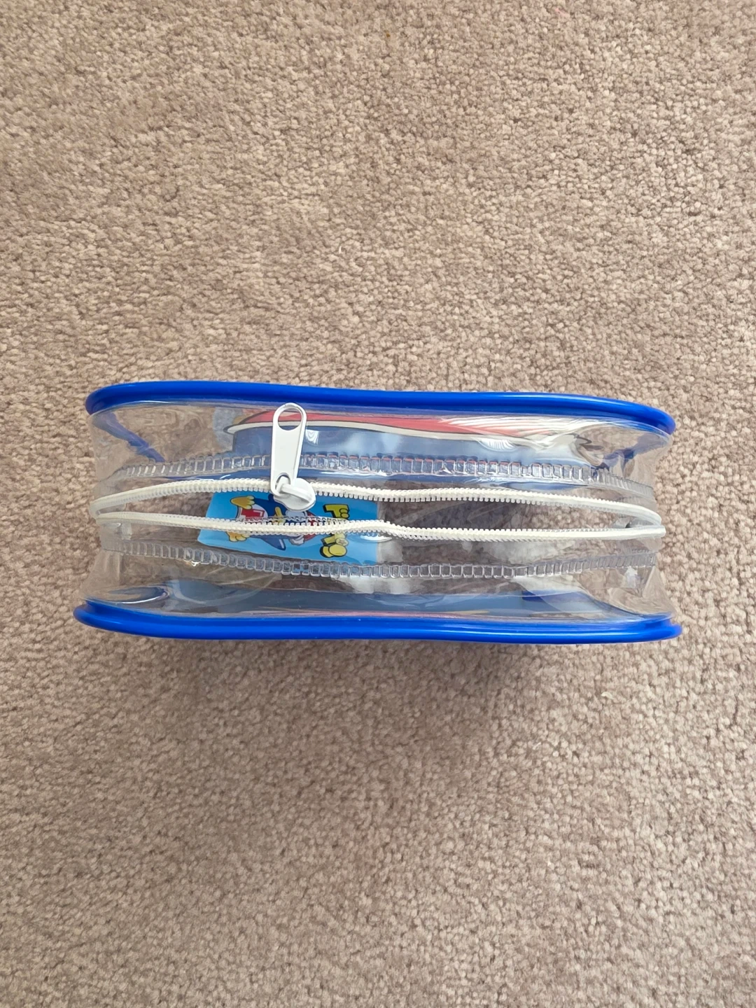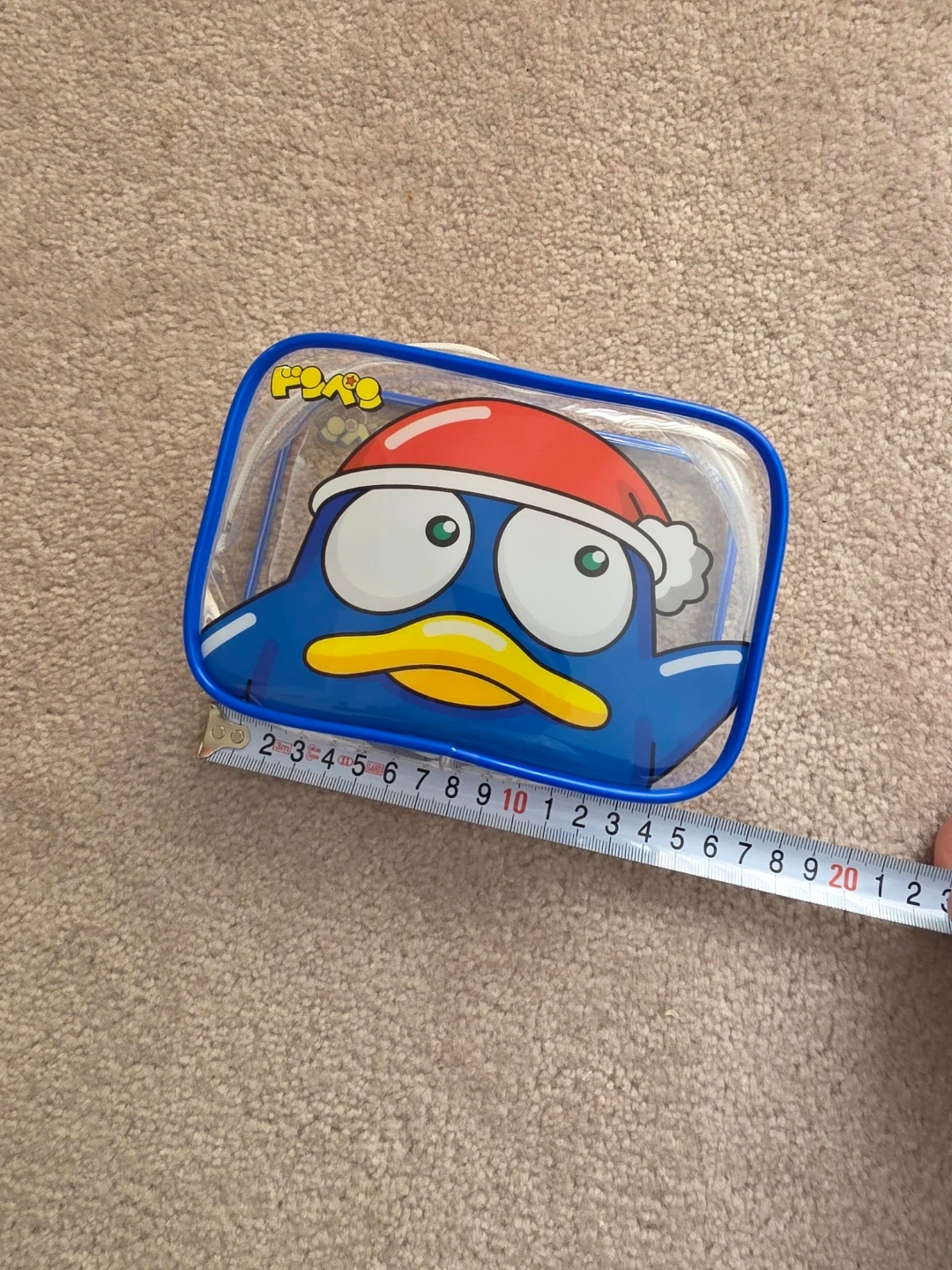 This is a clear bag featuring the Donki penguin wearing a Santa hat (the Japanese famous store). ***The zipper is broken.***. It's mainly for storing makeup or small stuffed toy.