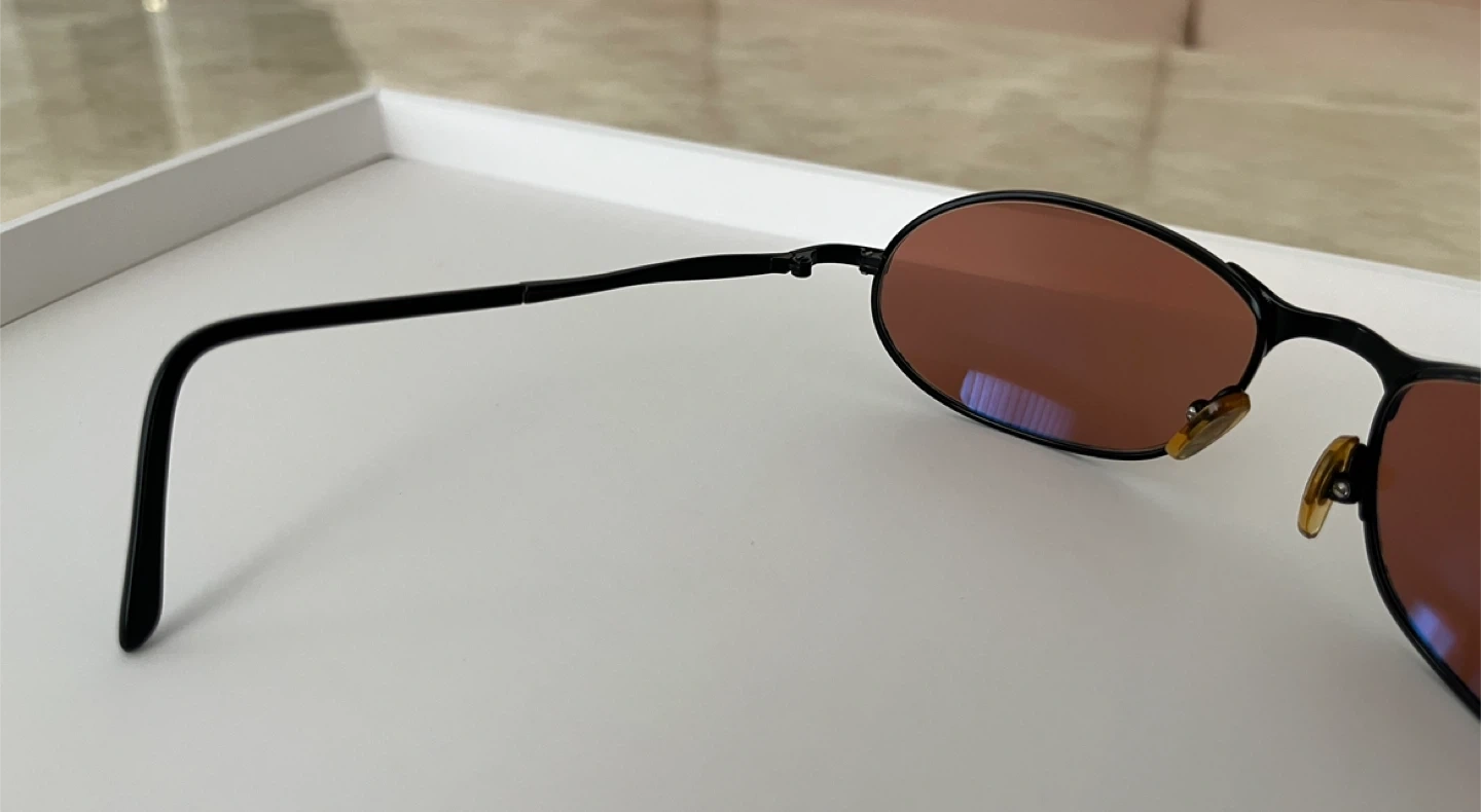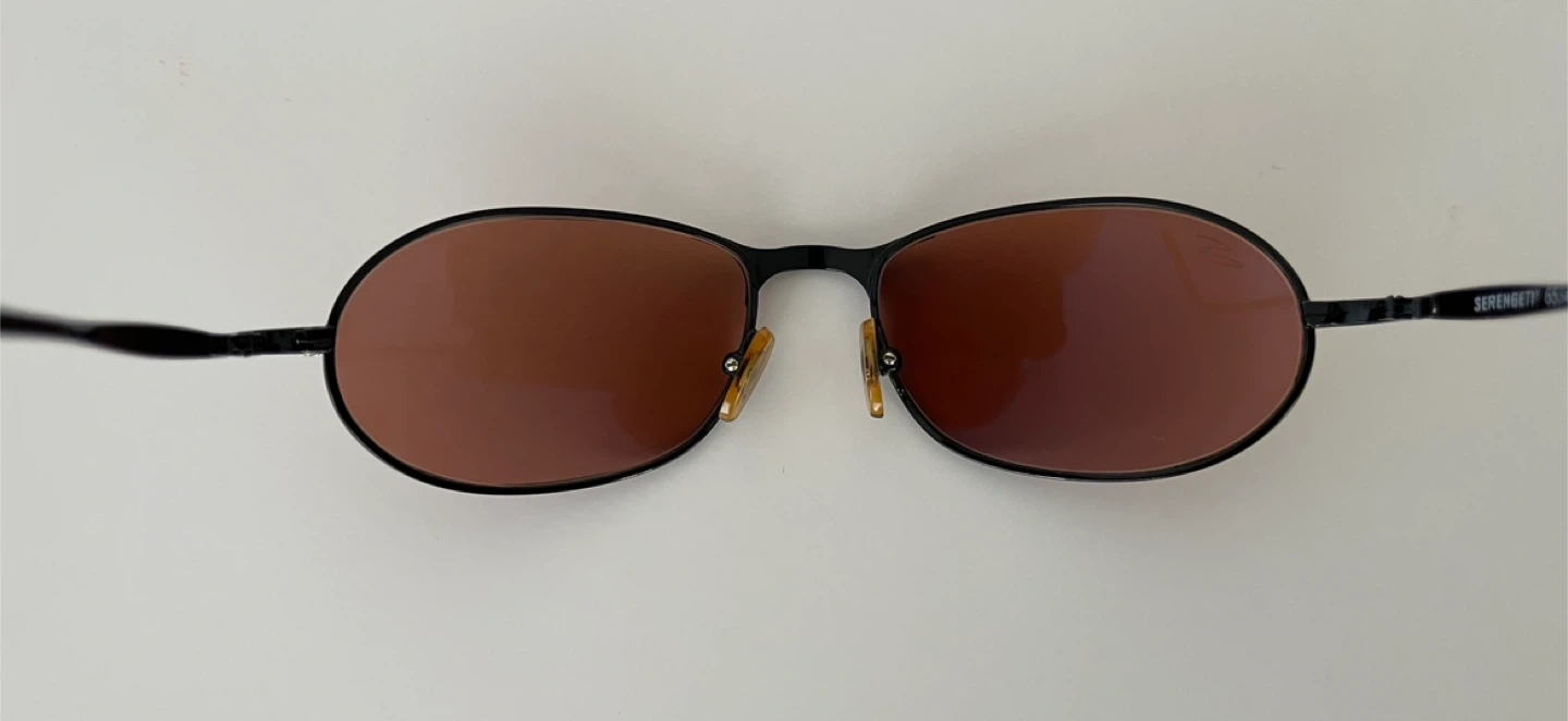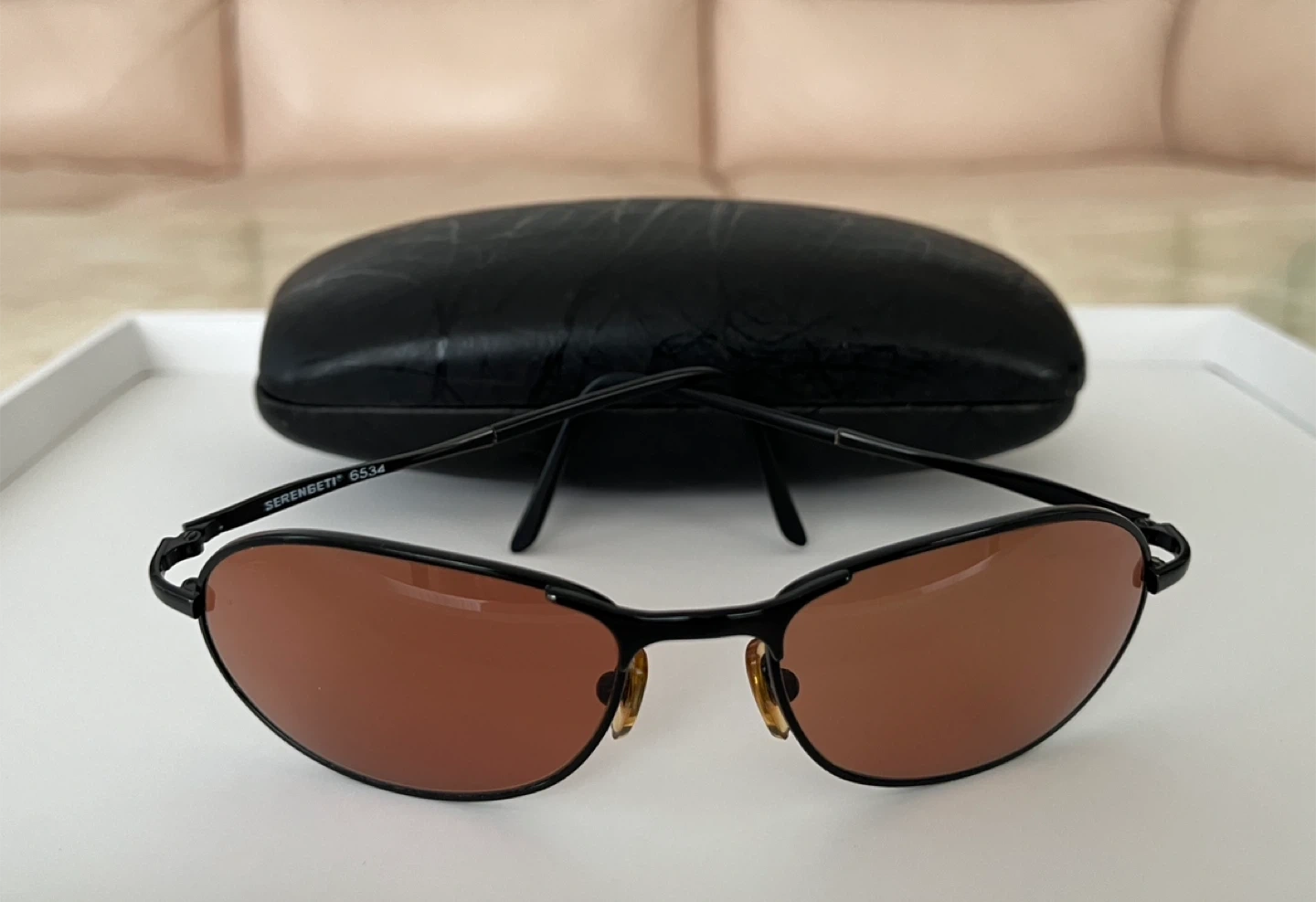 Serengeti sunglasses with brown lenses and a black frame. The model number 6534 is visible on the arm. Includes a black Serengeti hard case.